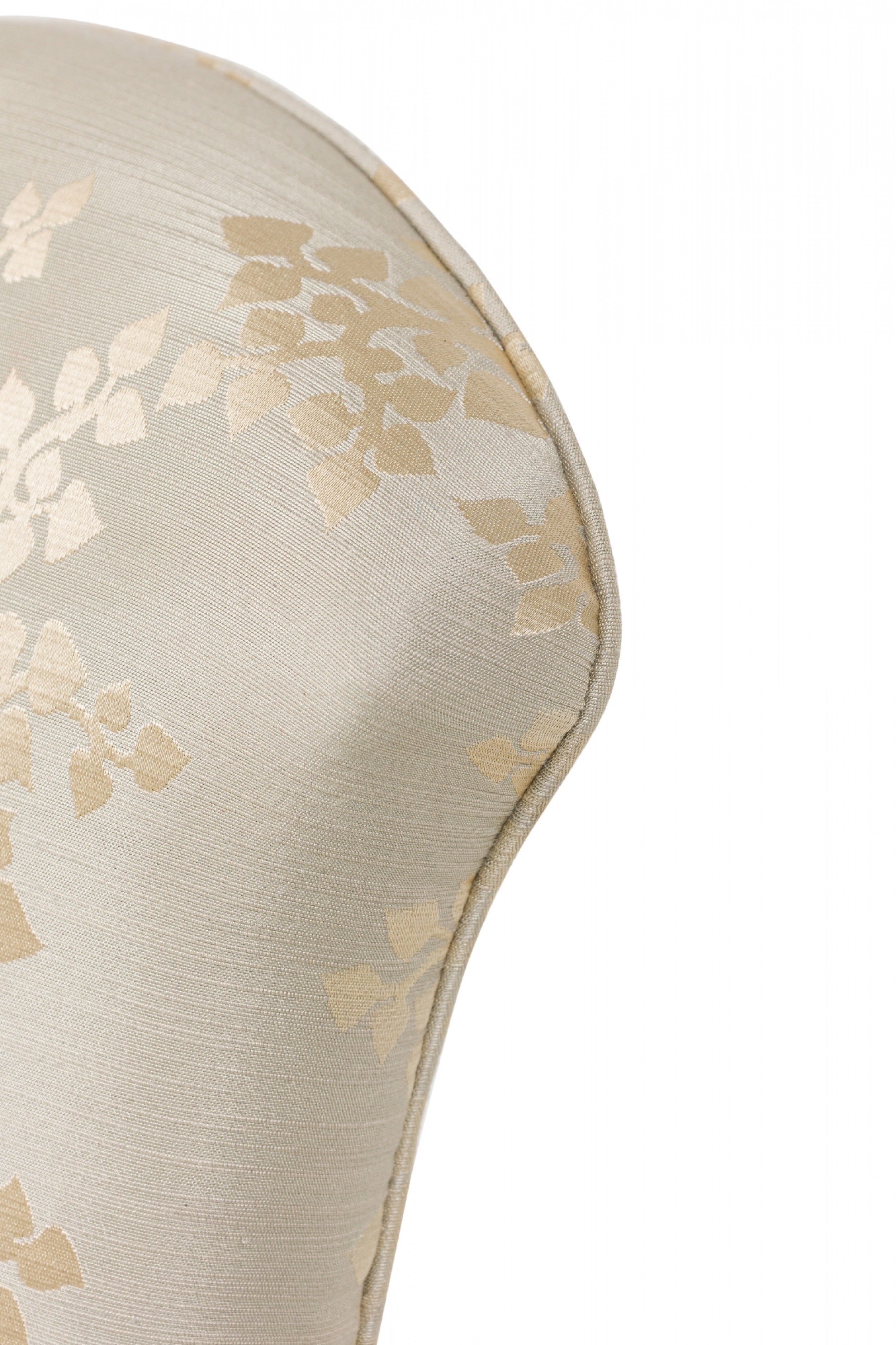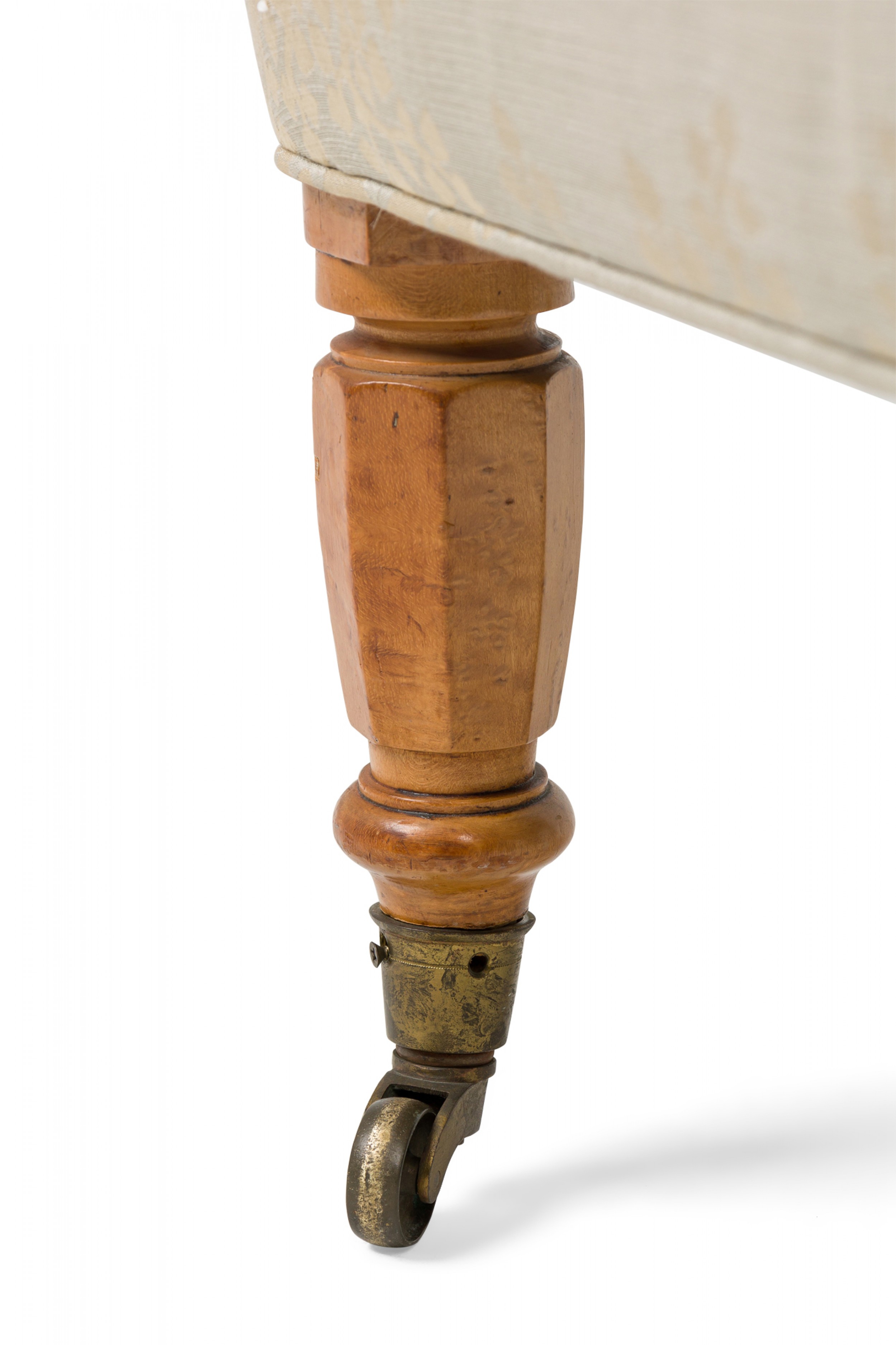 French Victorian (19th Century) maple armchair with a high shaped narrow back, having scroll-form arms, upholstered in a Dedar silk taupe floral damask, standing on turned front legs and back saber legs with casters..