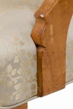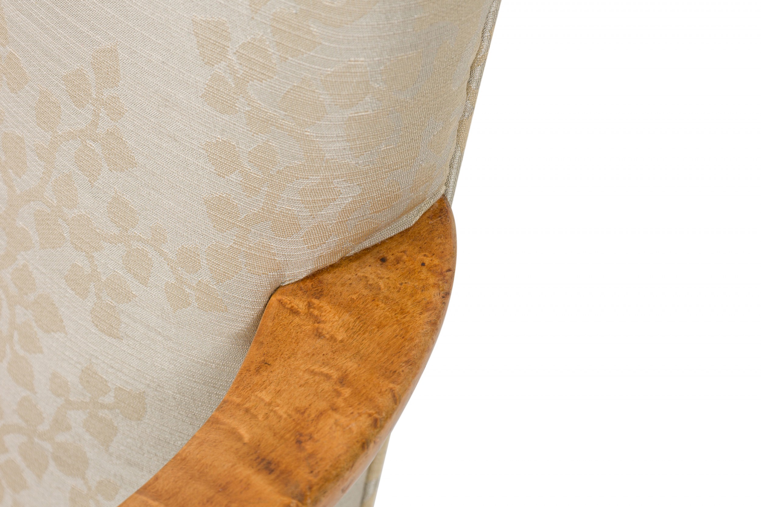 French Victorian Carved Bird's Eye Maple Armchair with Taupe Floral Damask Upholstery
