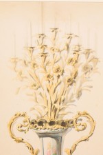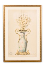 French Victorian colored print of a blue and gold vase in a gold frame (signed).