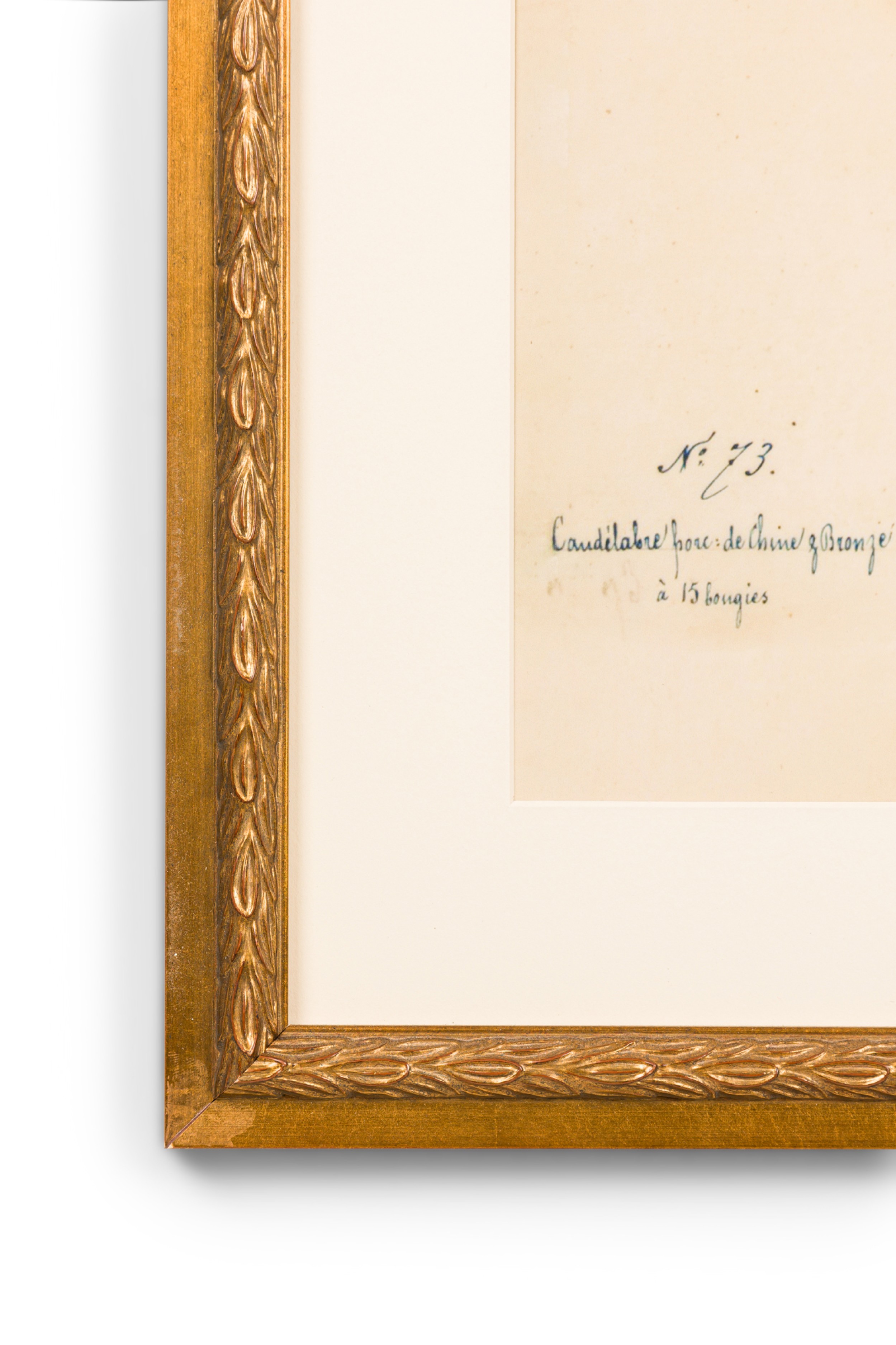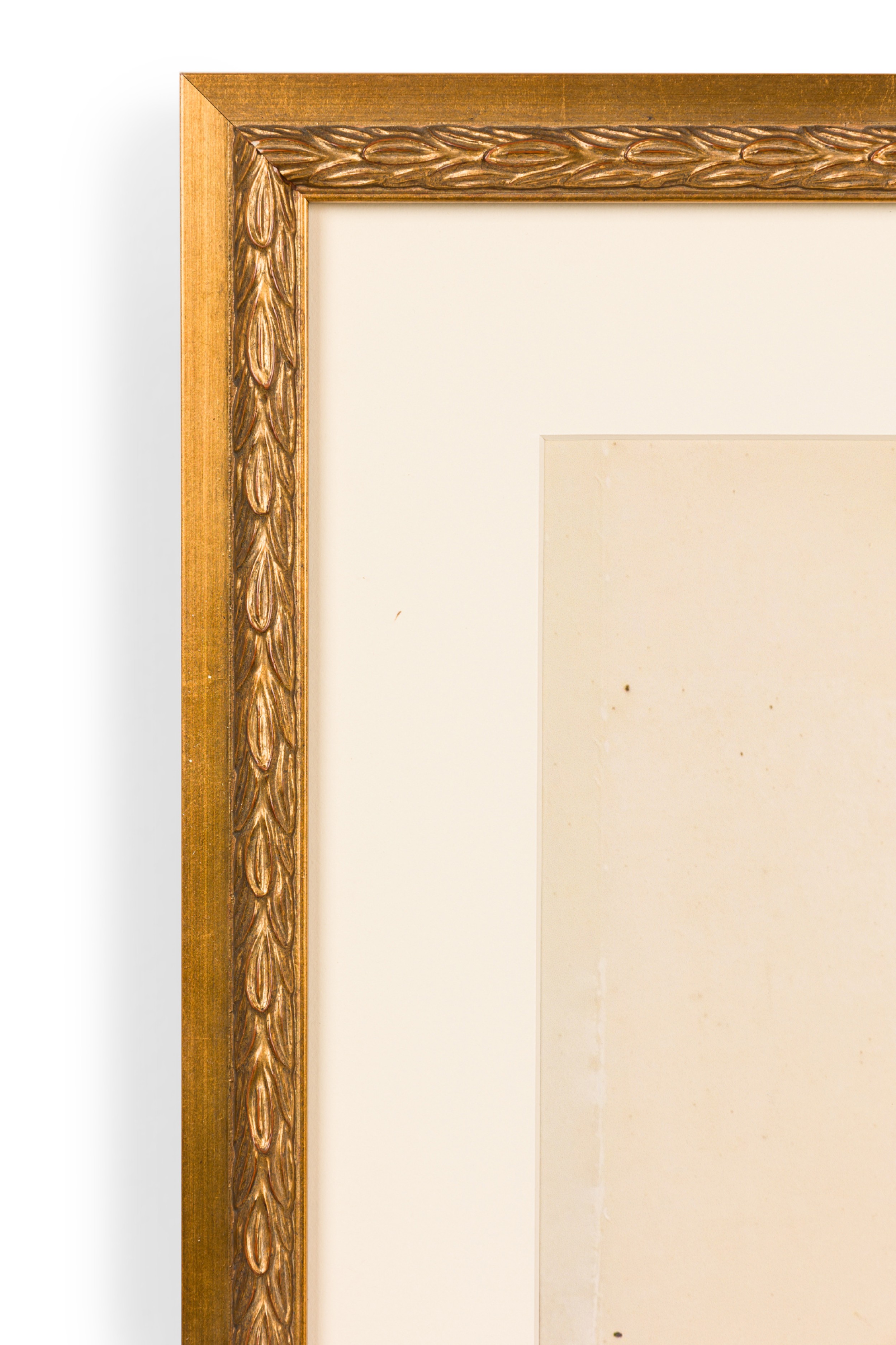 French Victorian colored print of a blue and gold vase in a gold frame (signed)