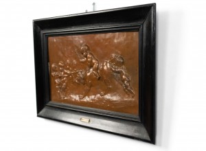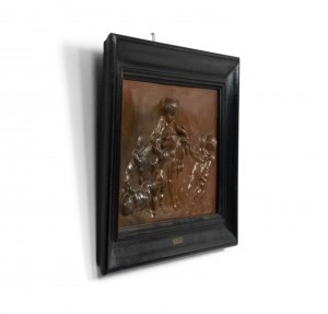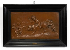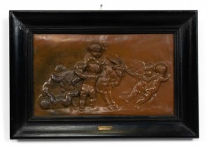 PAIR of French Victorian rectangular copper wall plaques of cupids and animals with ebonized frames. (signed SORREL) (PRICED AS PAIR).