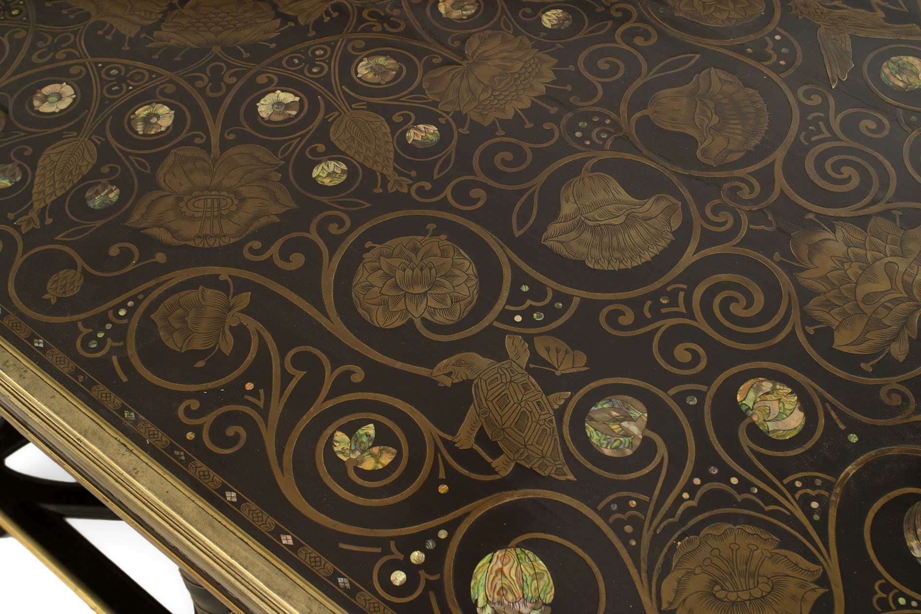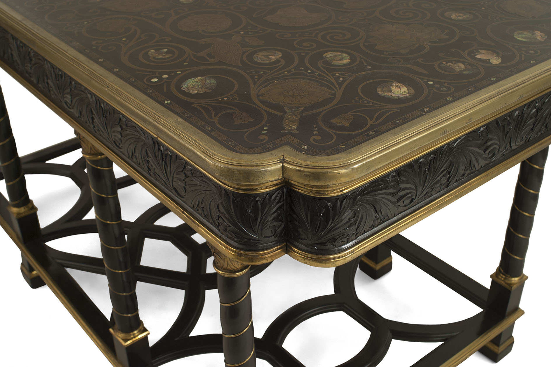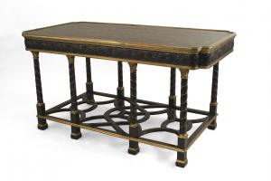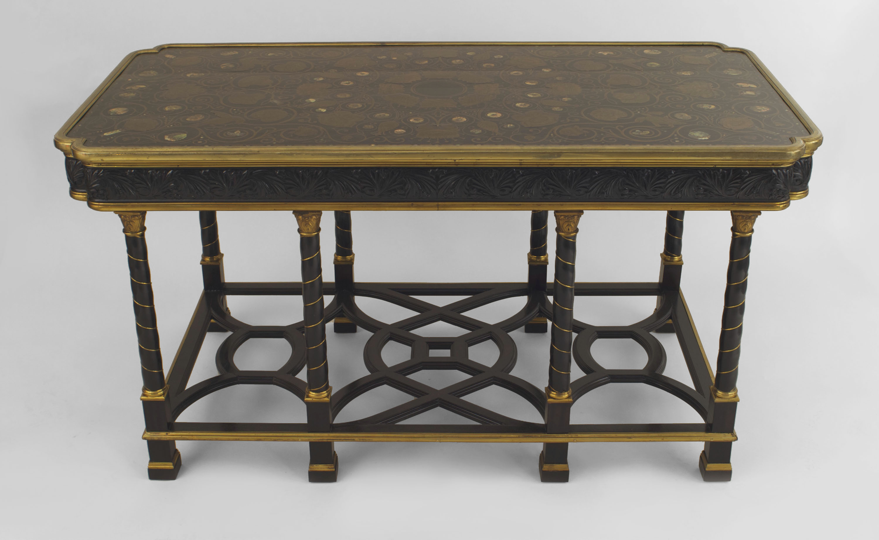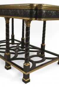 French Victorian (19/20th Century) ebony and bronze rectangular center table with 8 swirl design legs connected with an open geometric design stretcher and a top inlaid with pearl & brass floral & animal designs..