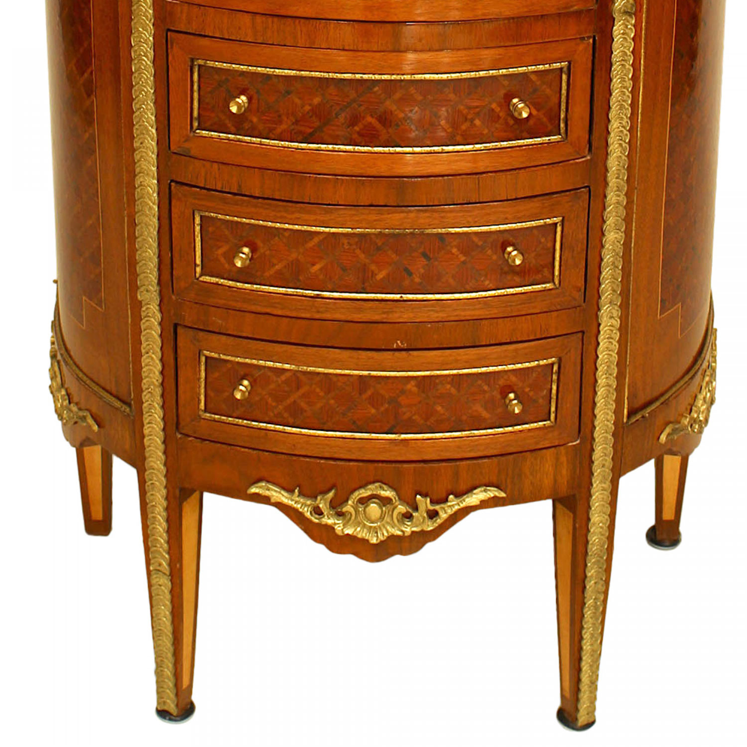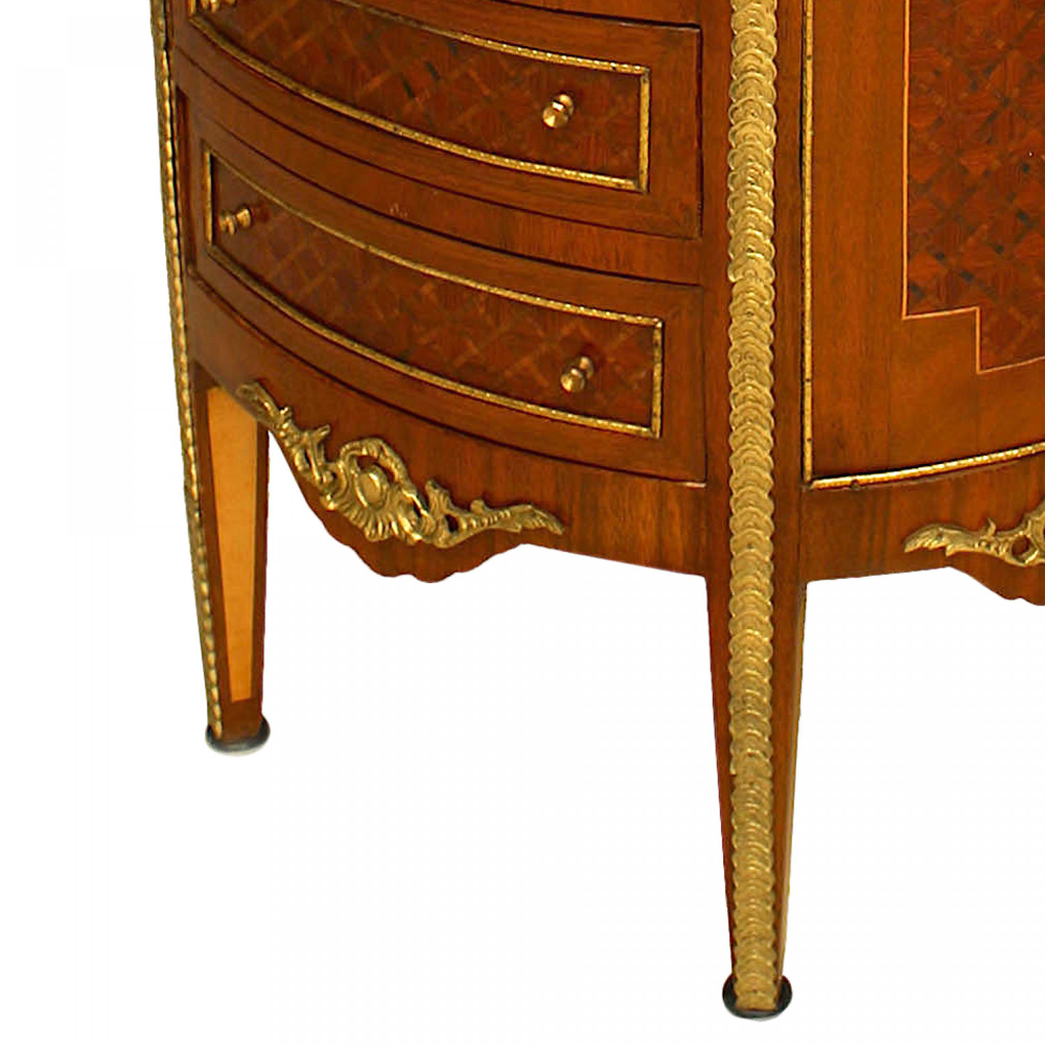 French Victorian (20th Century) fruitwood and parquetry inlaid demilune shaped narrow chest of drawers / semanier with bronze trim..