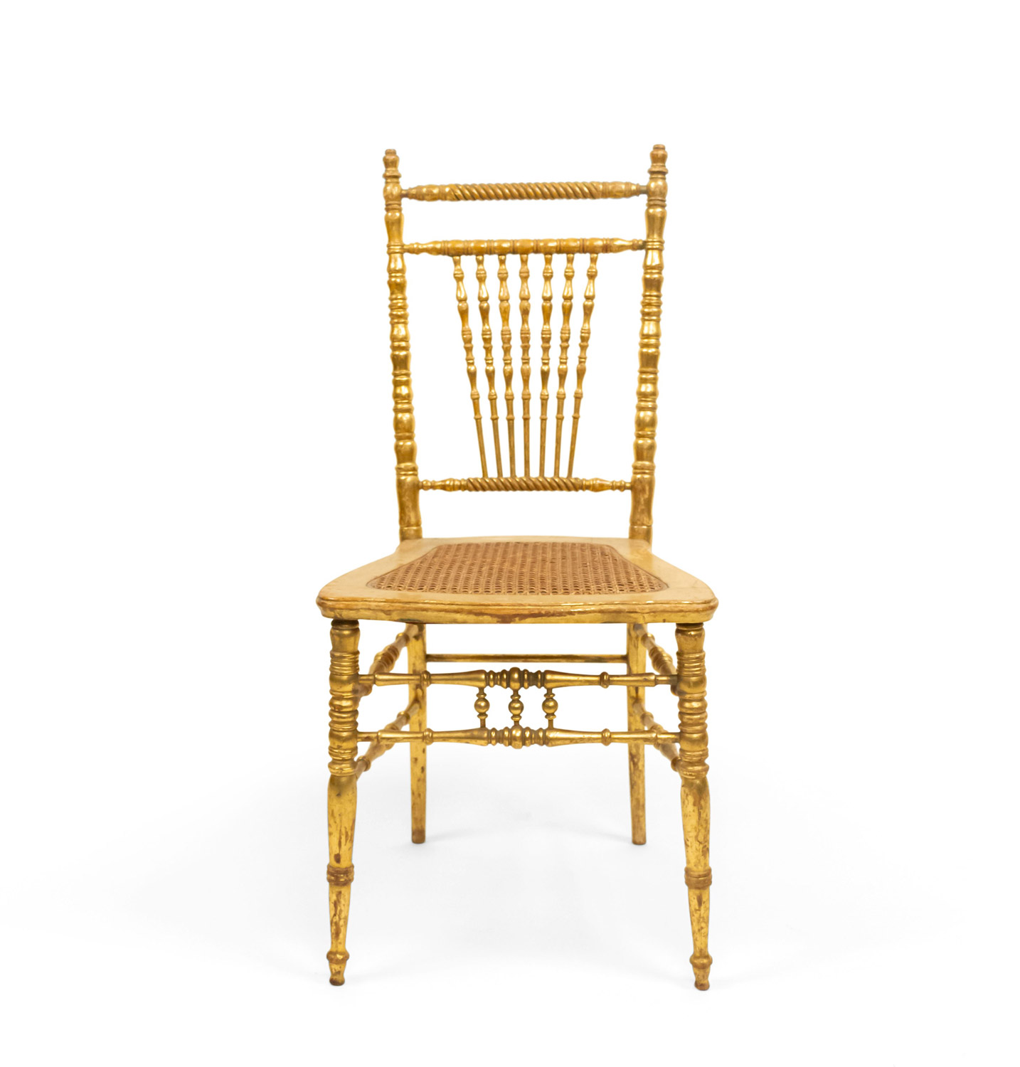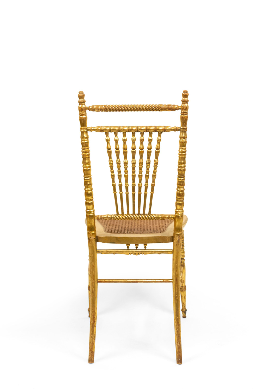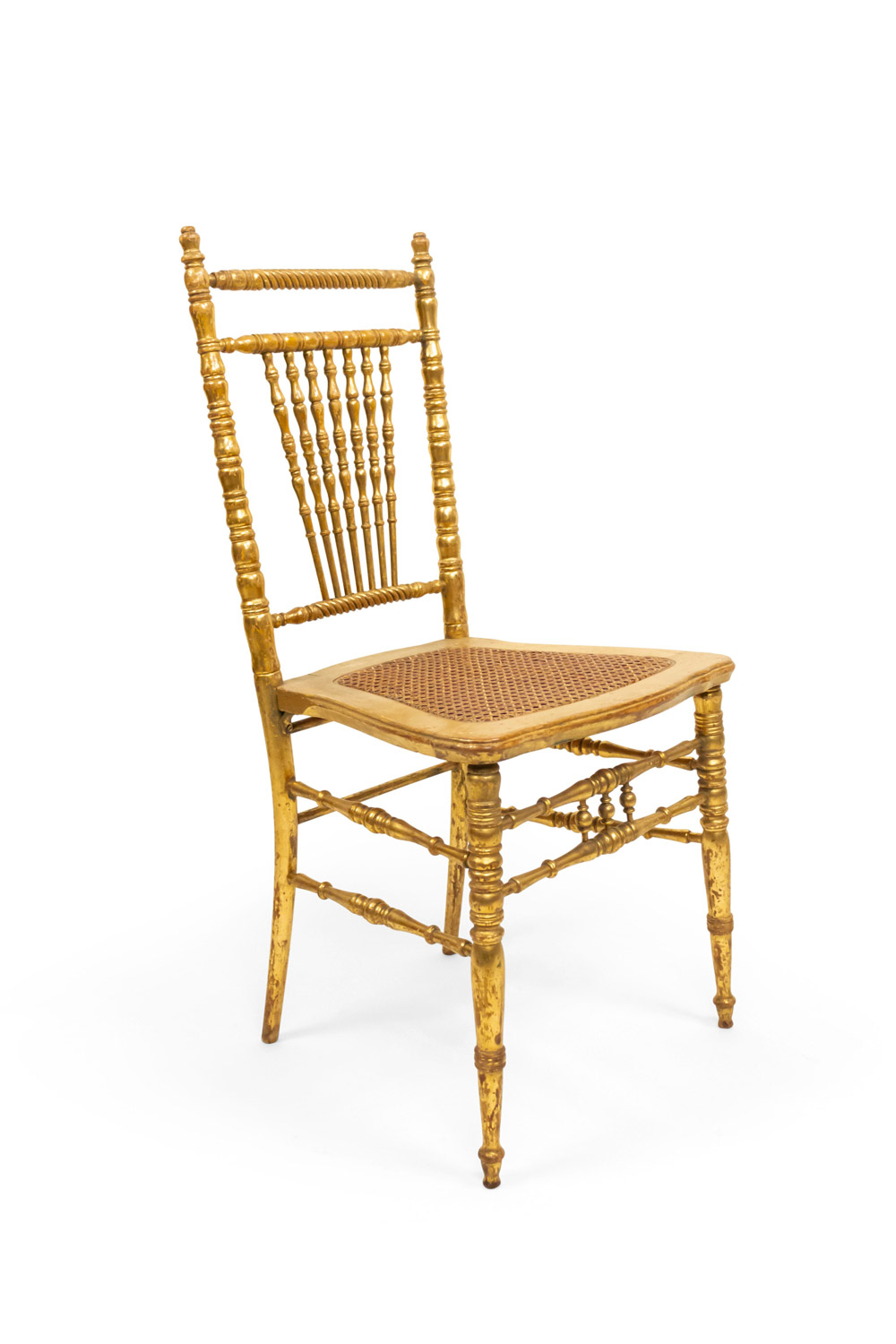 6 French Victorian style (mid-20th Century) gilt ballroom style side chairs with spindle back and twisted top rail with cane seat (PRICED EACH).