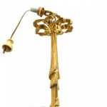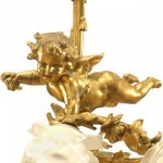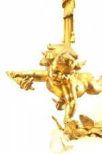 French Victorian gilt bronze chandelier with a drape form center shaft suspending a cupid holding 3 lights having glass flower shades..