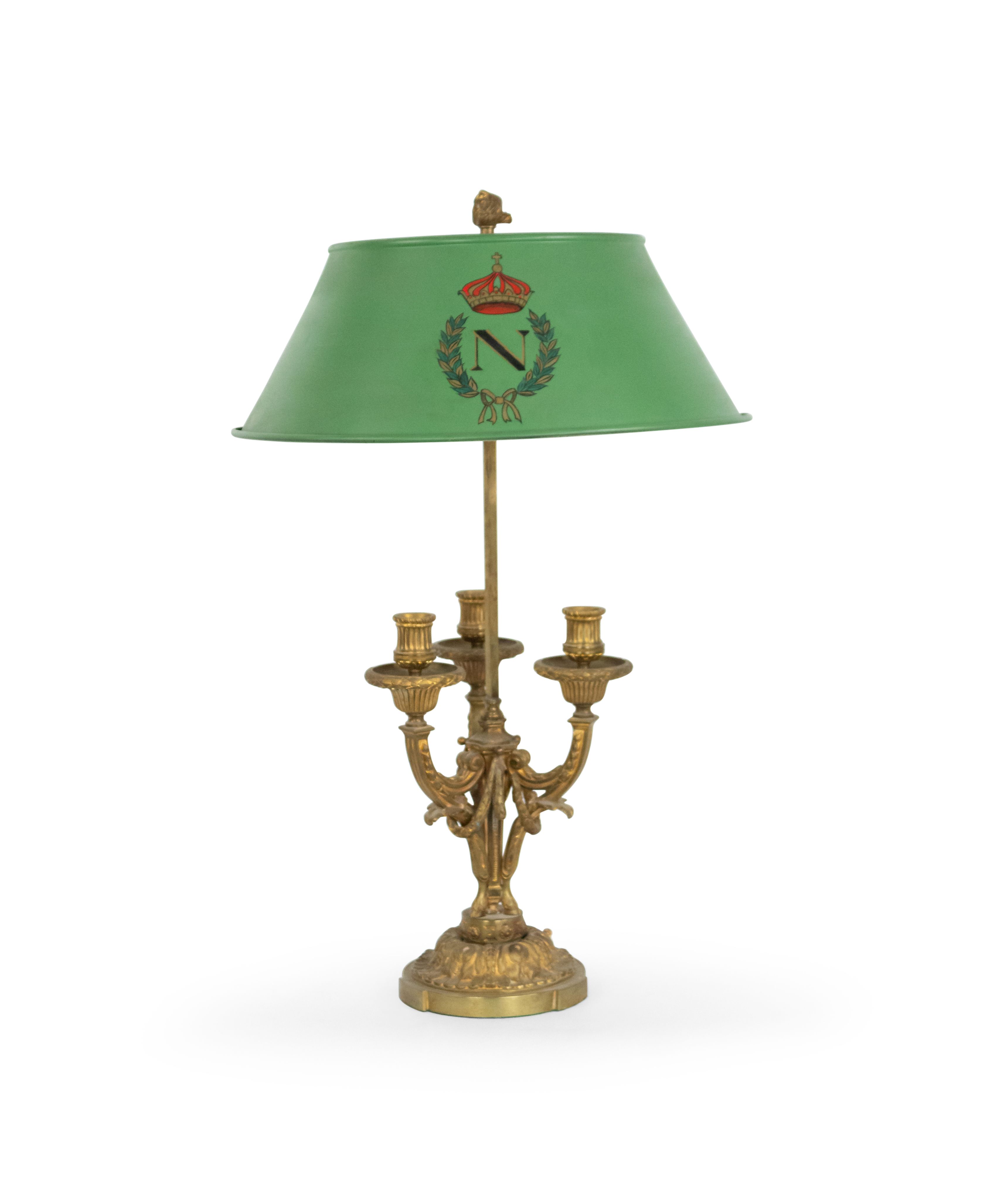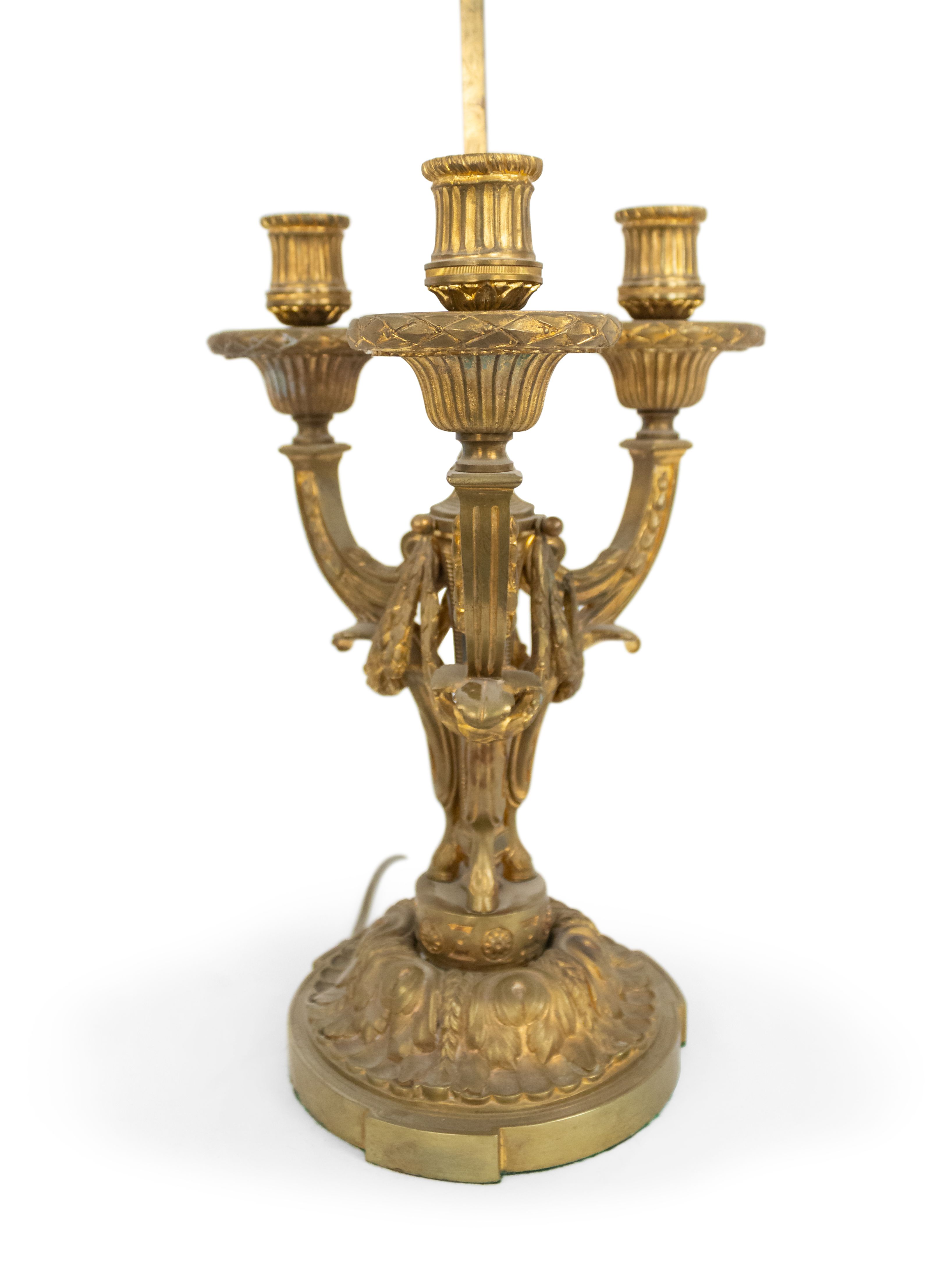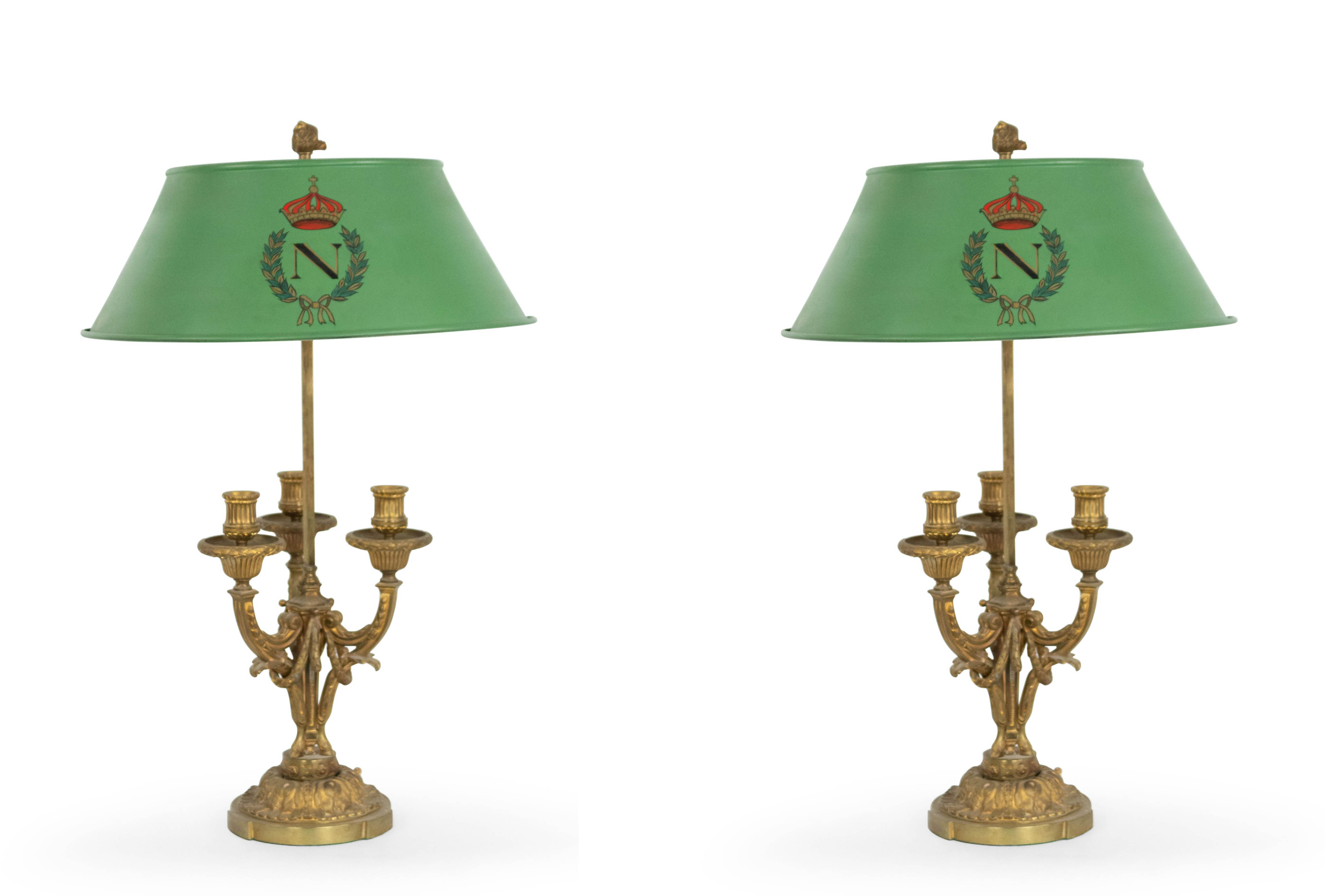 PAIR of French Victorian (19th/20th Century) gilt bronze 3 arm bouillotte lamps with foliate/swag details mounted on a round base with a round modern decorated tole shade with a flame finial (PRICED AS PAIR).