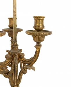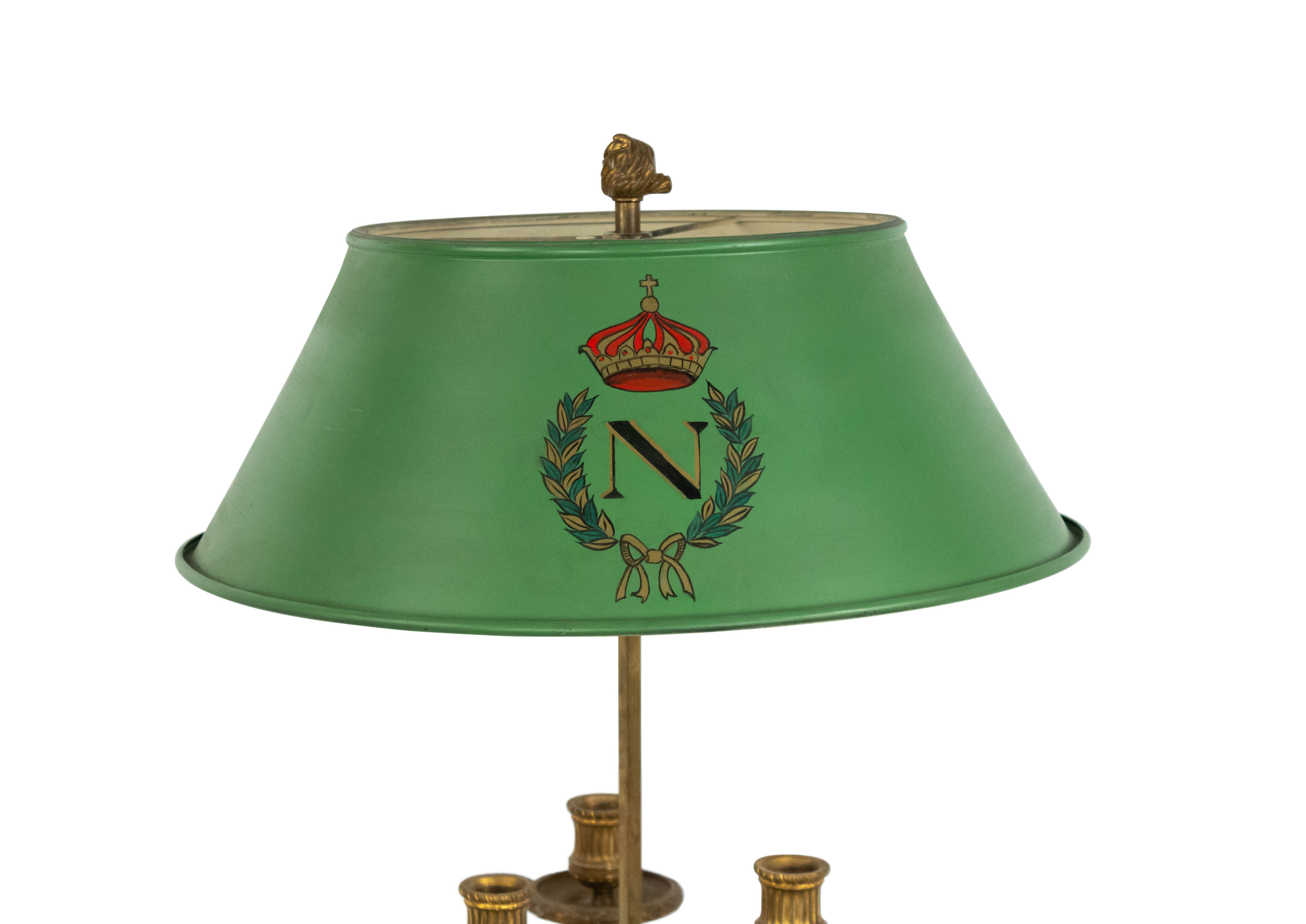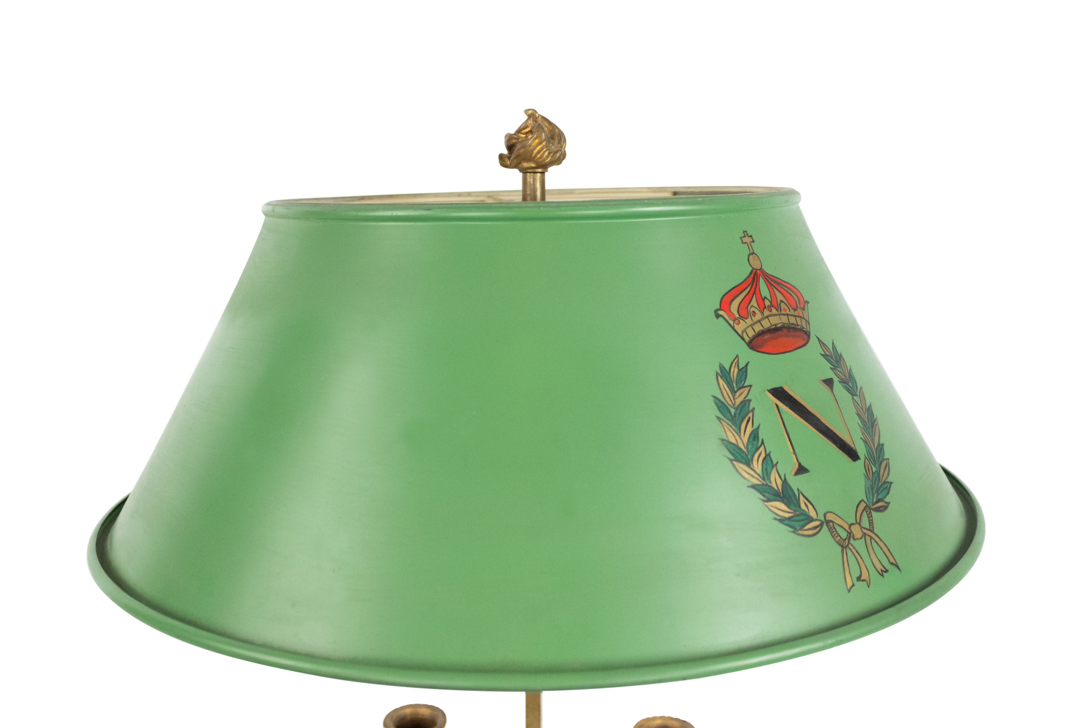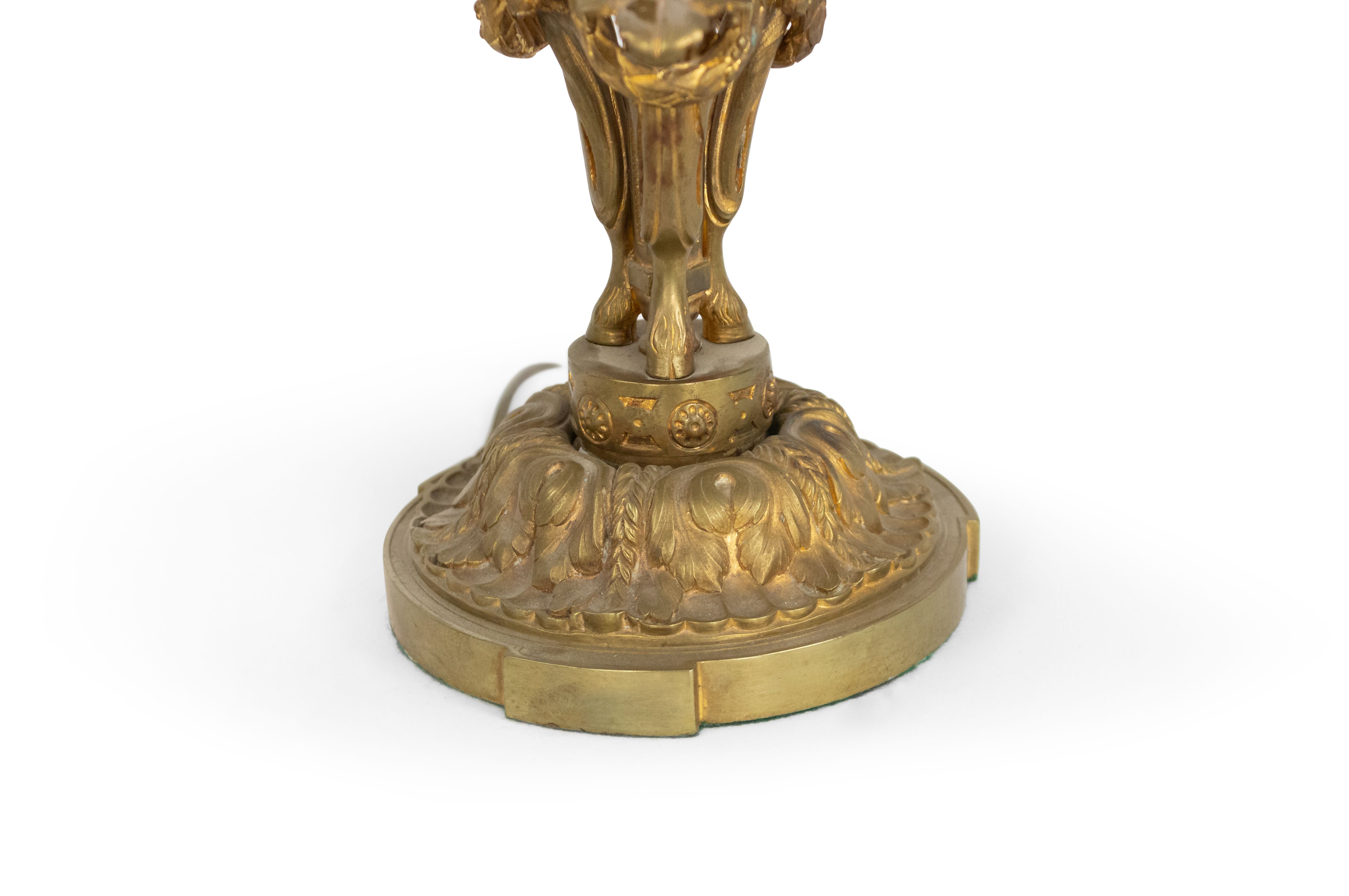 PAIR of French Victorian (19th/20th Century) gilt bronze 3 arm bouillotte lamps with foliate/swag details mounted on a round base with a round modern decorated tole shade with a flame finial (PRICED AS PAIR).