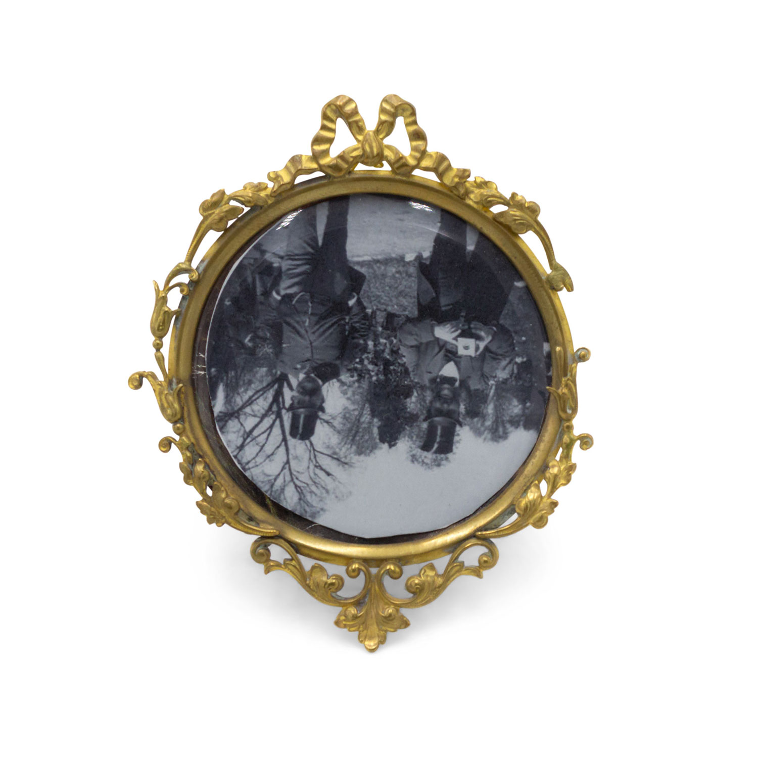 French Victorian-style small round shaped gilt metal easel picture frame with floral and filigree design and bow knot top.