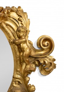 French Victorian monumental giltwood vertical wall mirror with cupid and scroll carving.