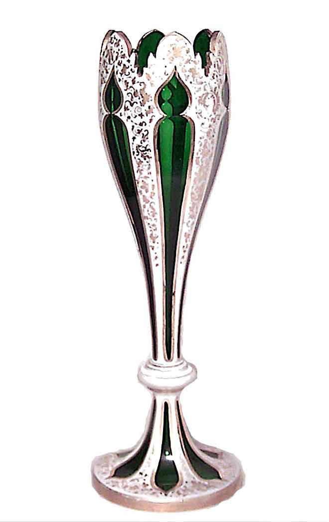 French Victorian green and white glass overlay and gold trimmed vase with flair shape..