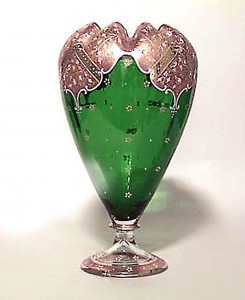 French Victorian green glass bulbous shaped vase with gilt and enamel floral design and faceted top (as is, small chip on base)