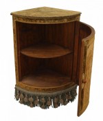 French Victorian-style green velvet upholstered corner commode cabinet with needlepoint front door panel..