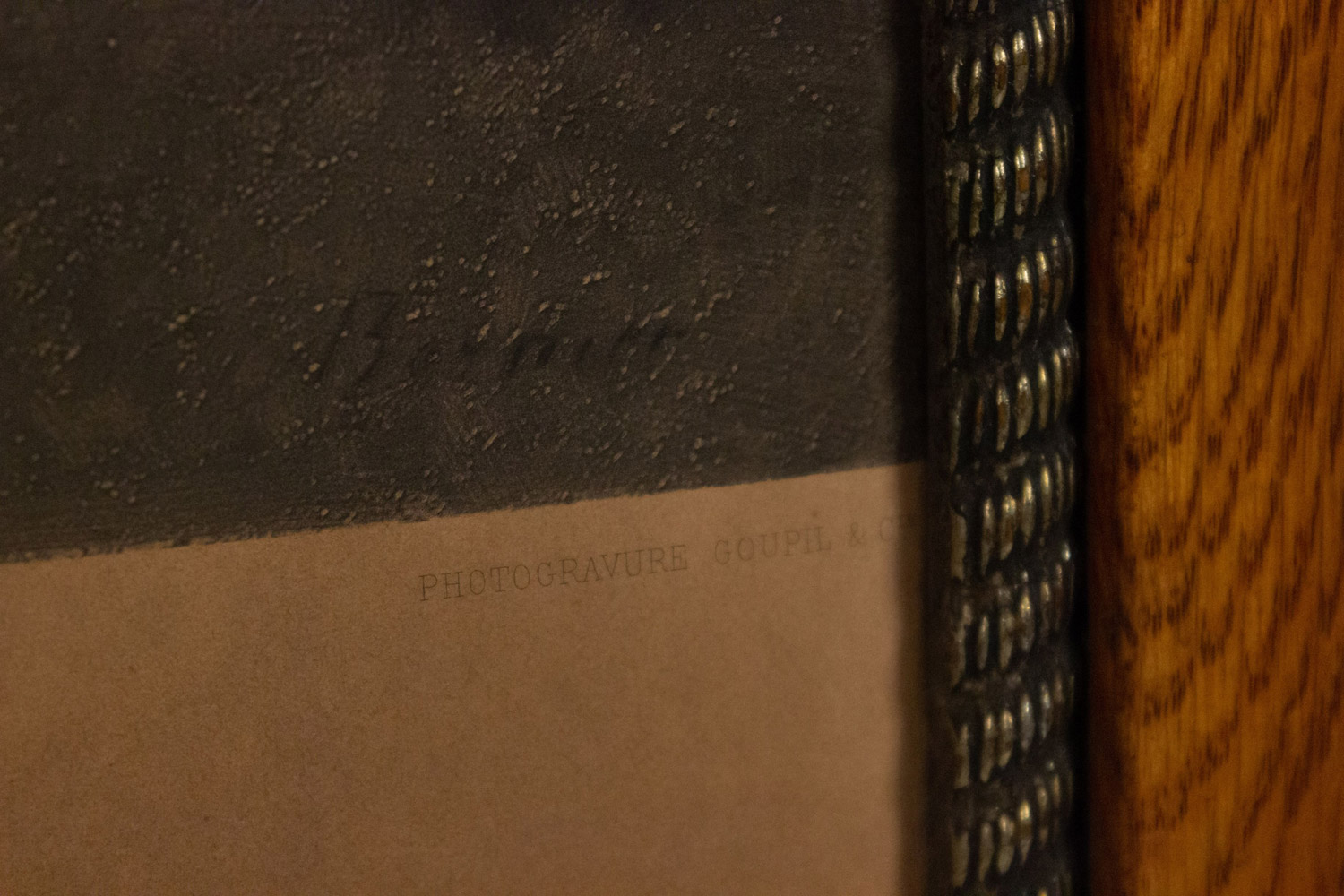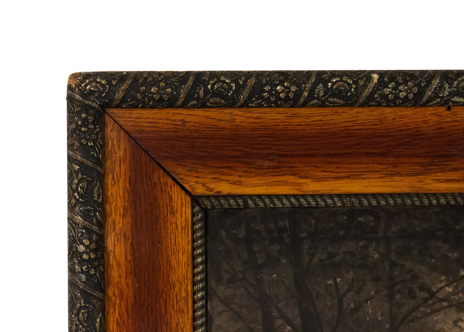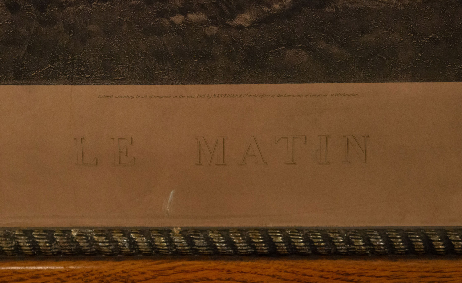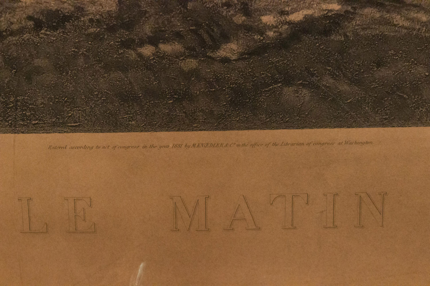 French Victorian oak framed engraving of landscape titled: "Le Matin" or "The Morning"
