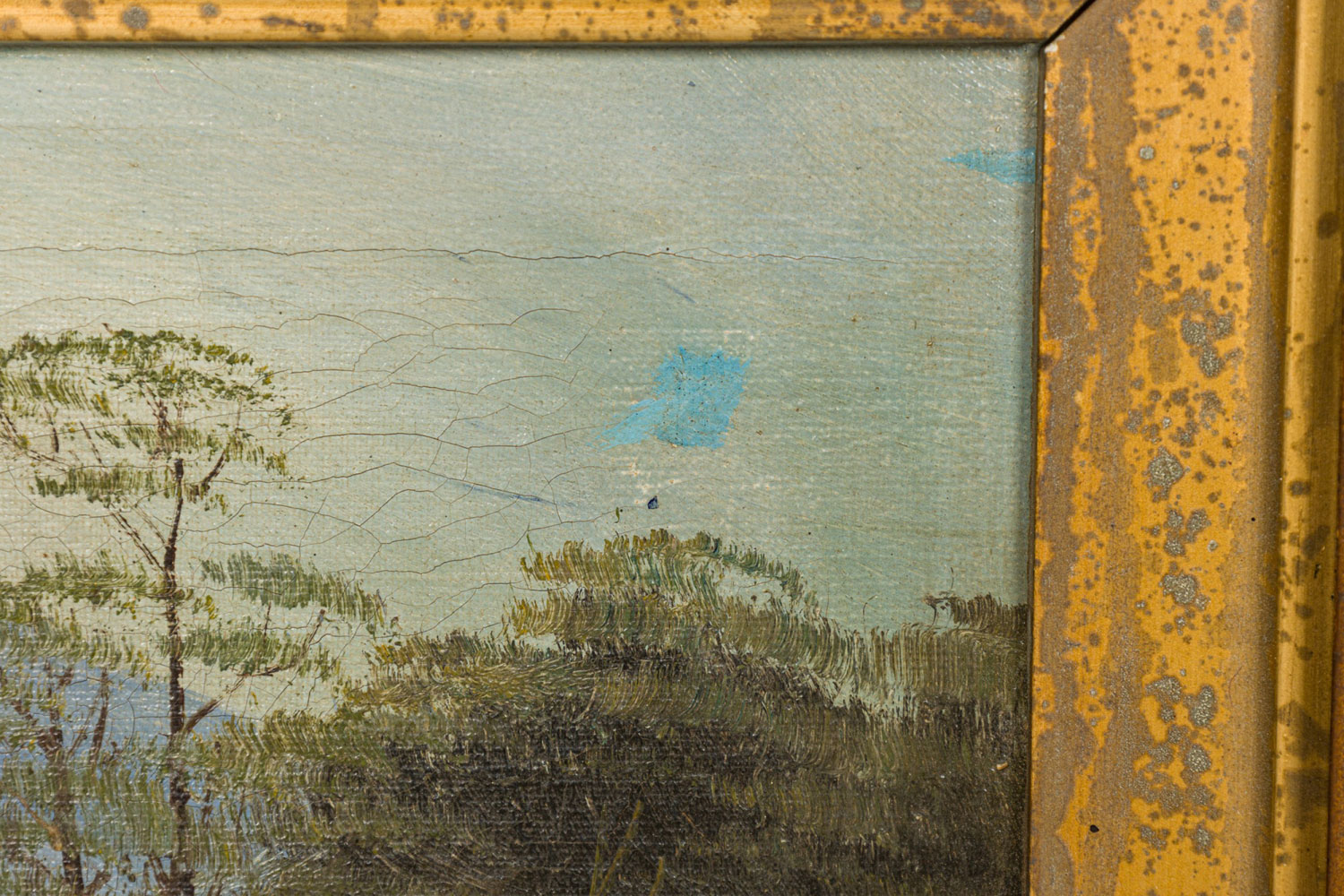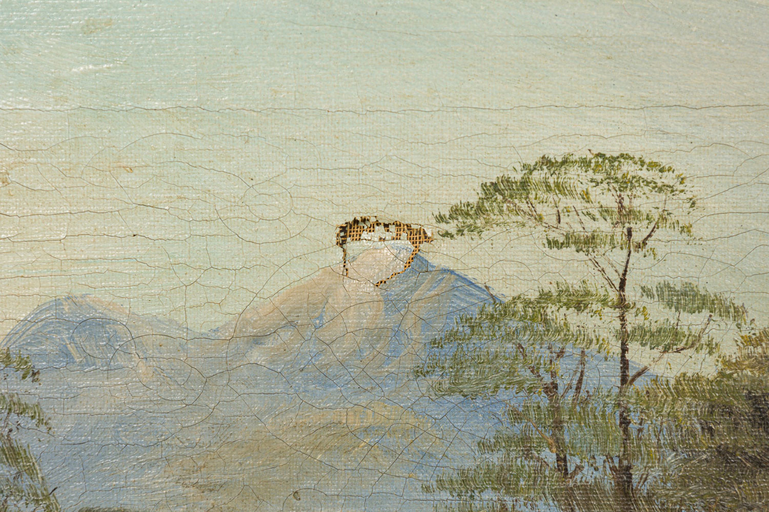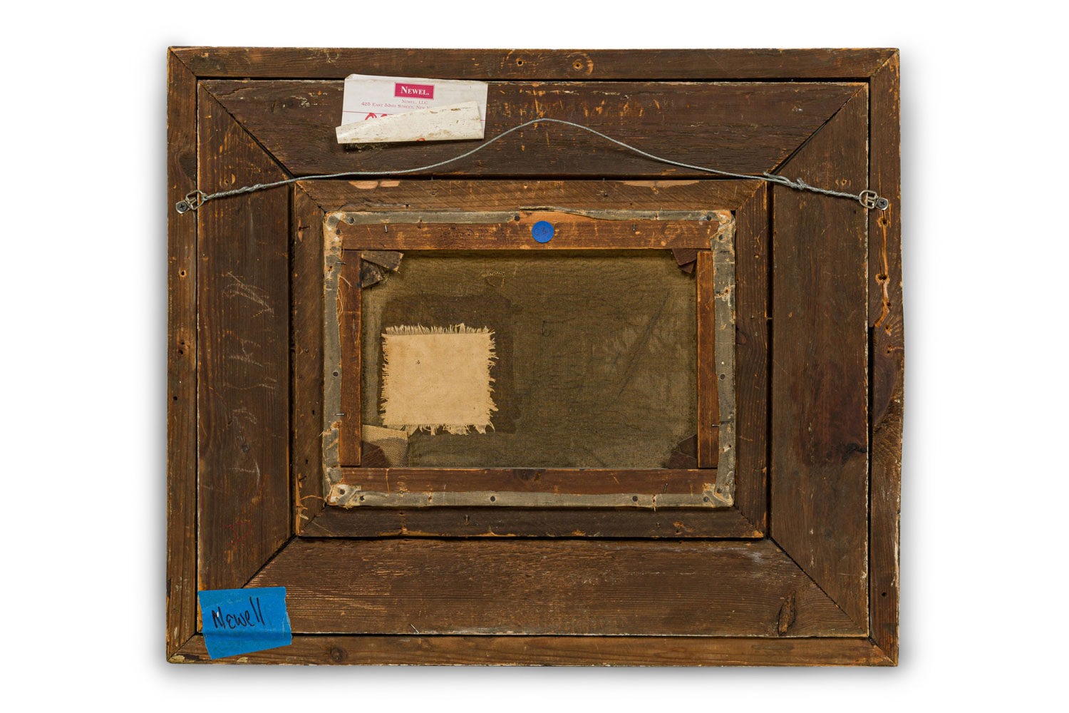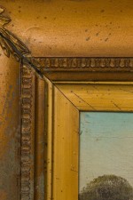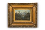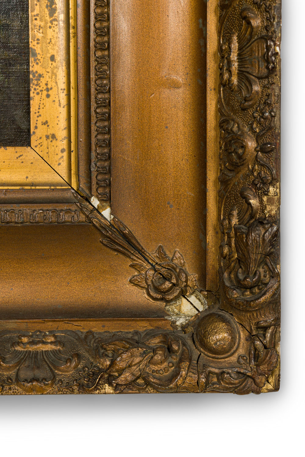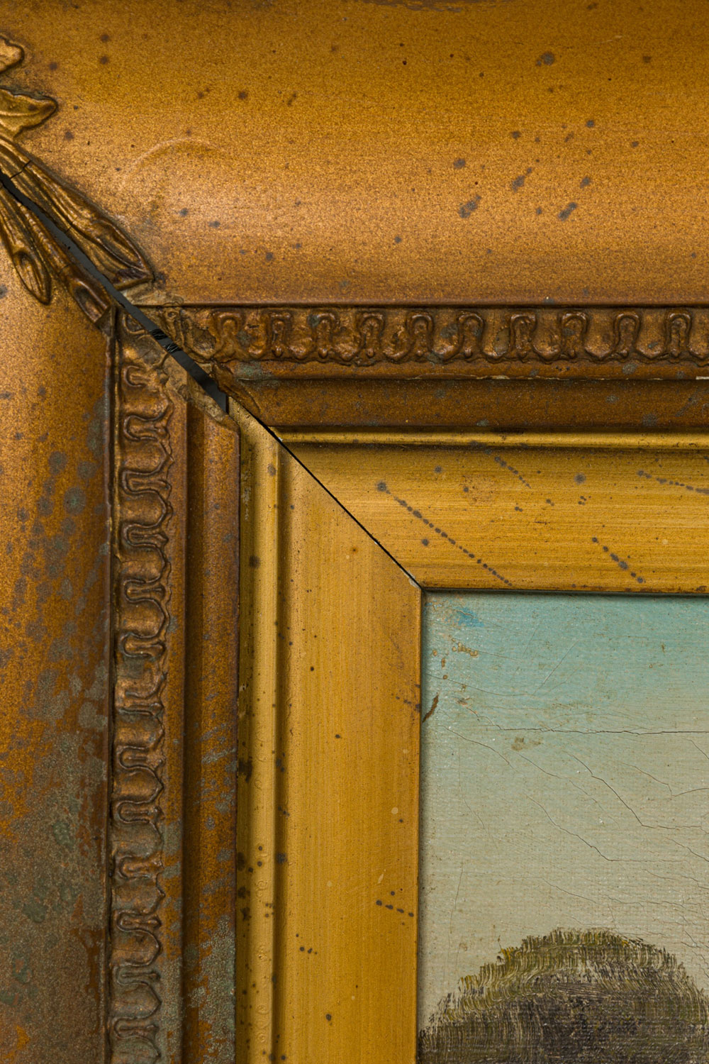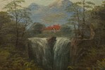 French Victorian gilt framed oil landscape painting of house with red roof by 2 waterfalls..