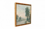 French (19th Cent) gilt framed oil landscape Impressionist style painting with stream and tree.