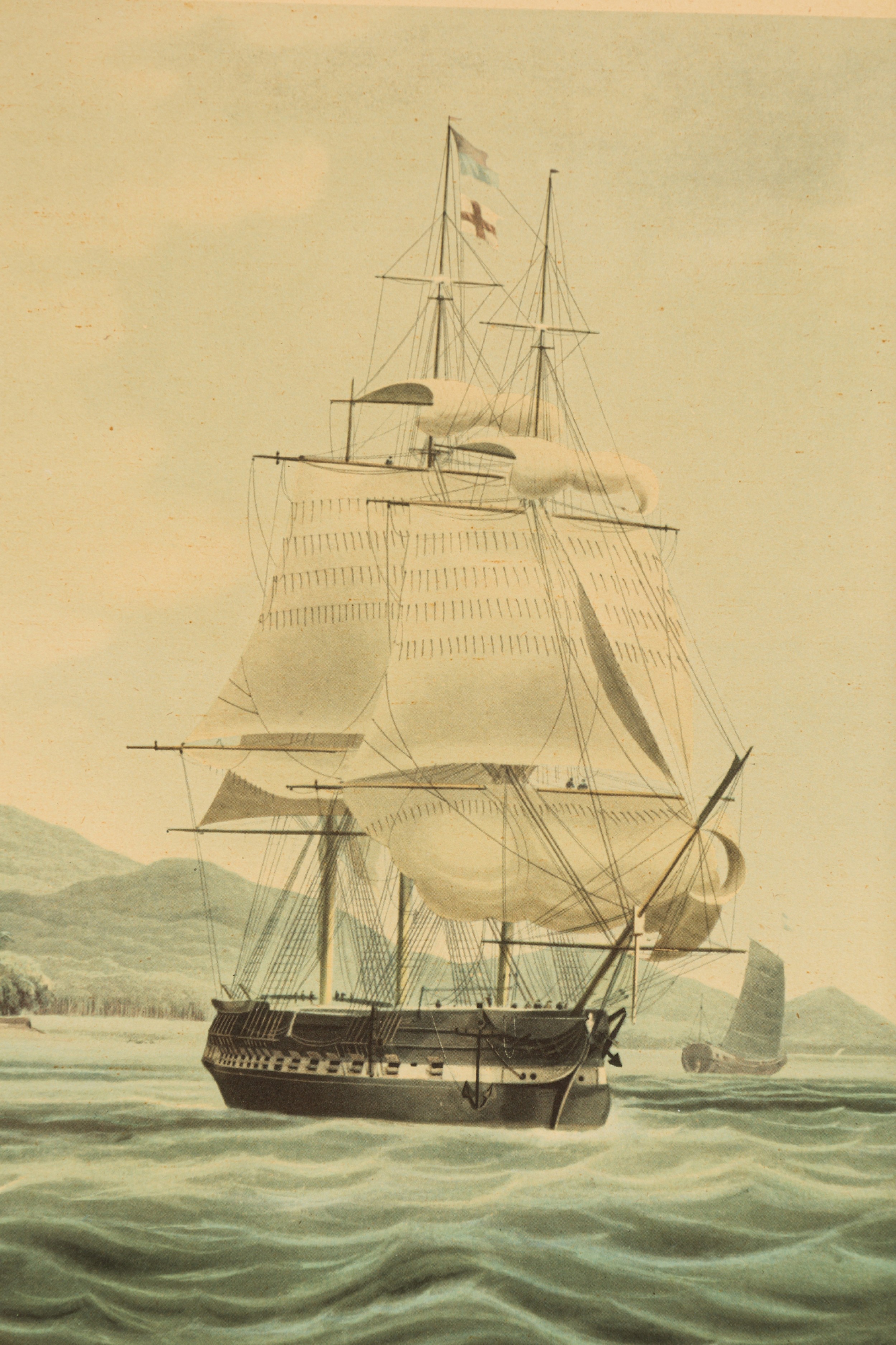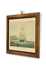 French Victorian lithograph of a large sail boat and two row boats near with a view of a coastal town in the backgound.