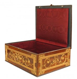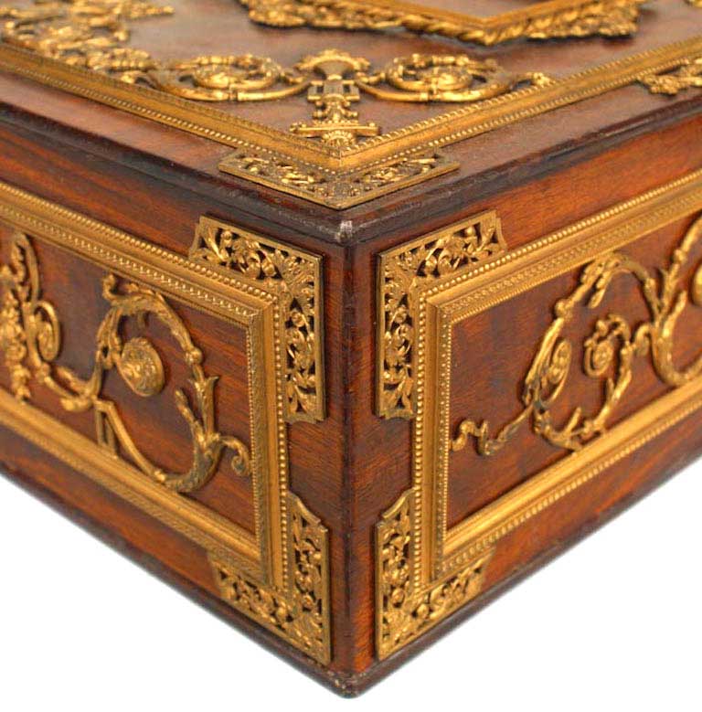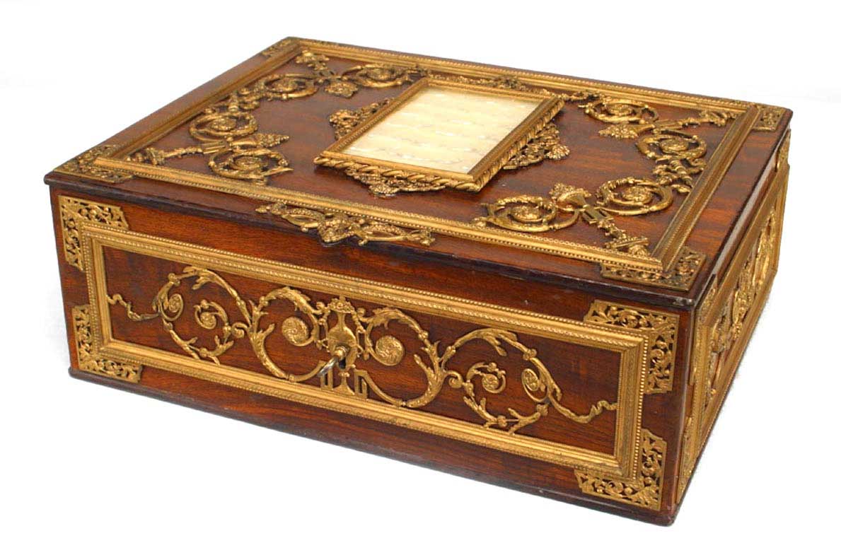 French Victorian large faux wood painted metal jewel box with bronze dore trim and center frame.