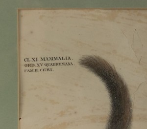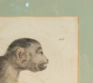 French Victorian colored engraving of monkey figure standing in green & black trimmed frame (as is, minor rips on paper)(1. Gatt. Colobus, illig.) (similar to Inv. #030290).