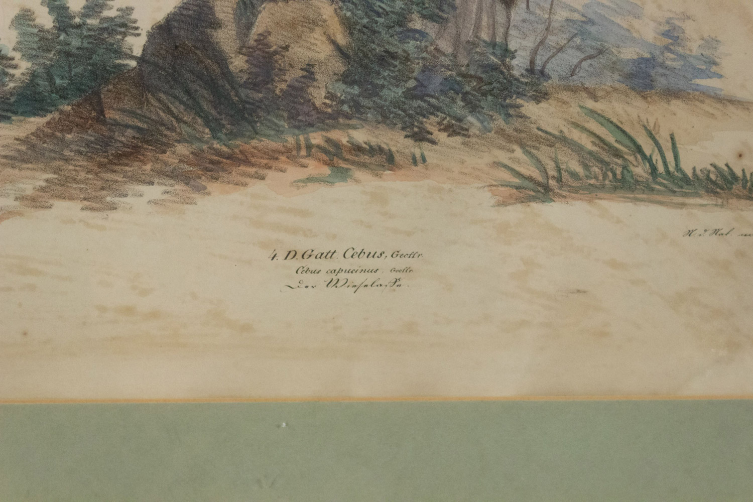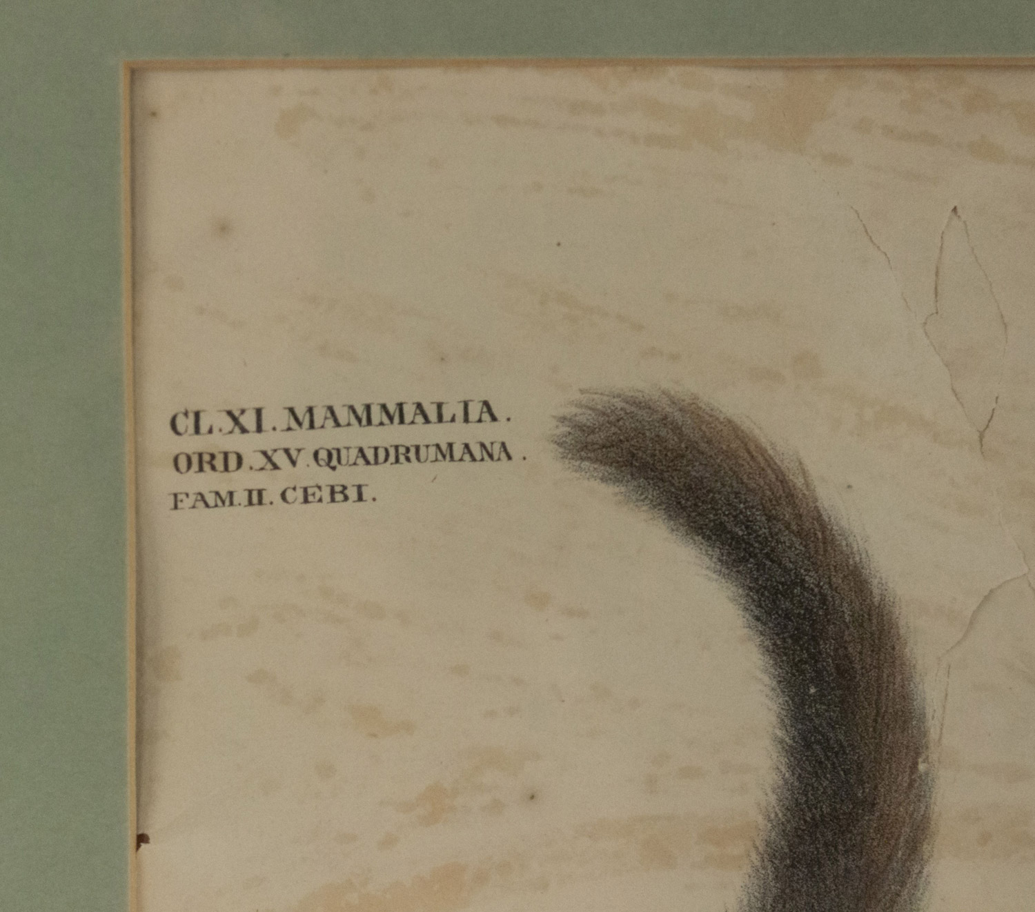 French Victorian colored engraving of monkey figure standing in green & black trimmed frame (as is, minor rips on paper)(1. Gatt. Colobus, illig.) (similar to Inv. #030290)