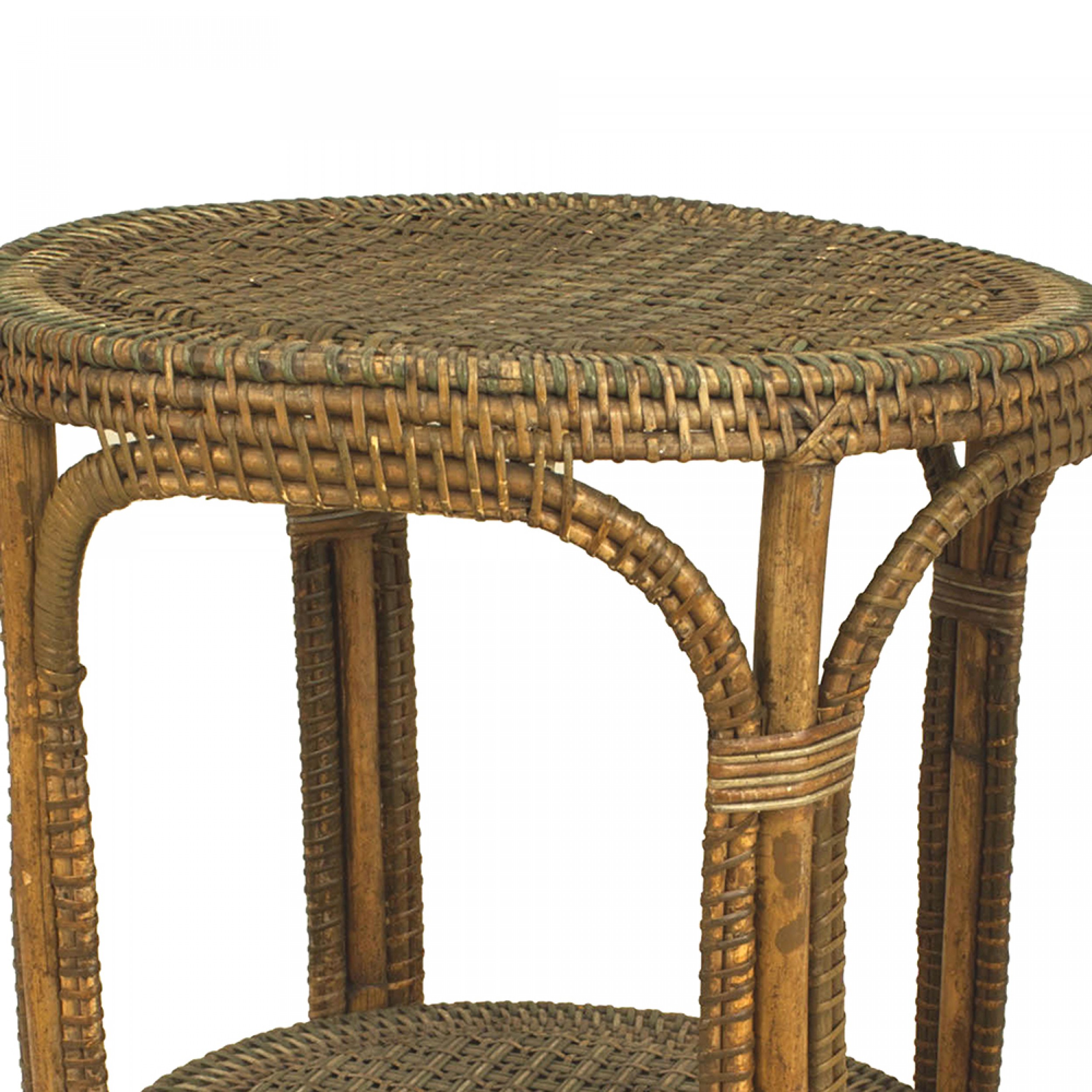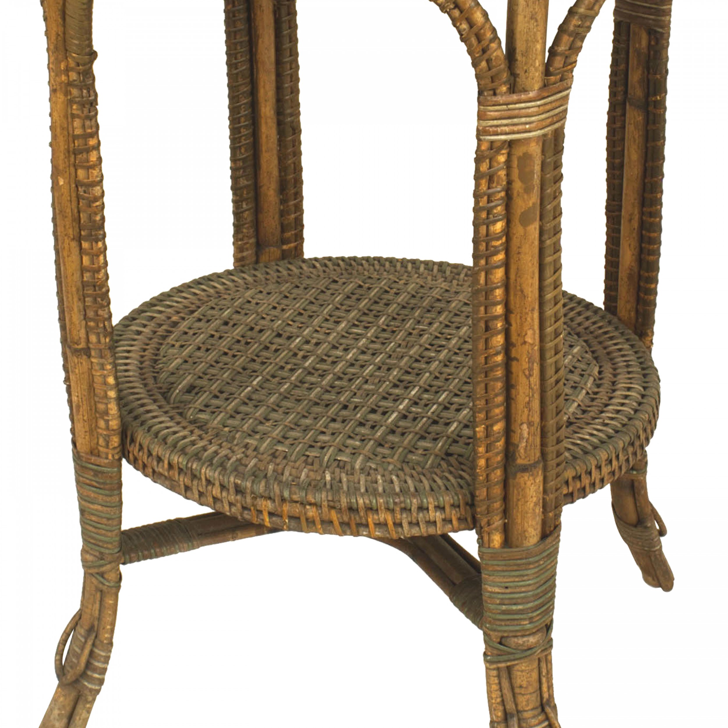French Victorian natural wicker round end table with a shelf trimmed with green & white wrapping (PERET & VIBERT metal label)(Related item: loveseat 060664)