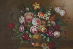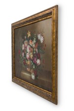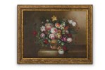 French victorian style still life featuring a bouquet of flowers in a gold vase with a 5 leaf yellow flower resembling a star in floral coloured oils on canvas in a gilt frame.