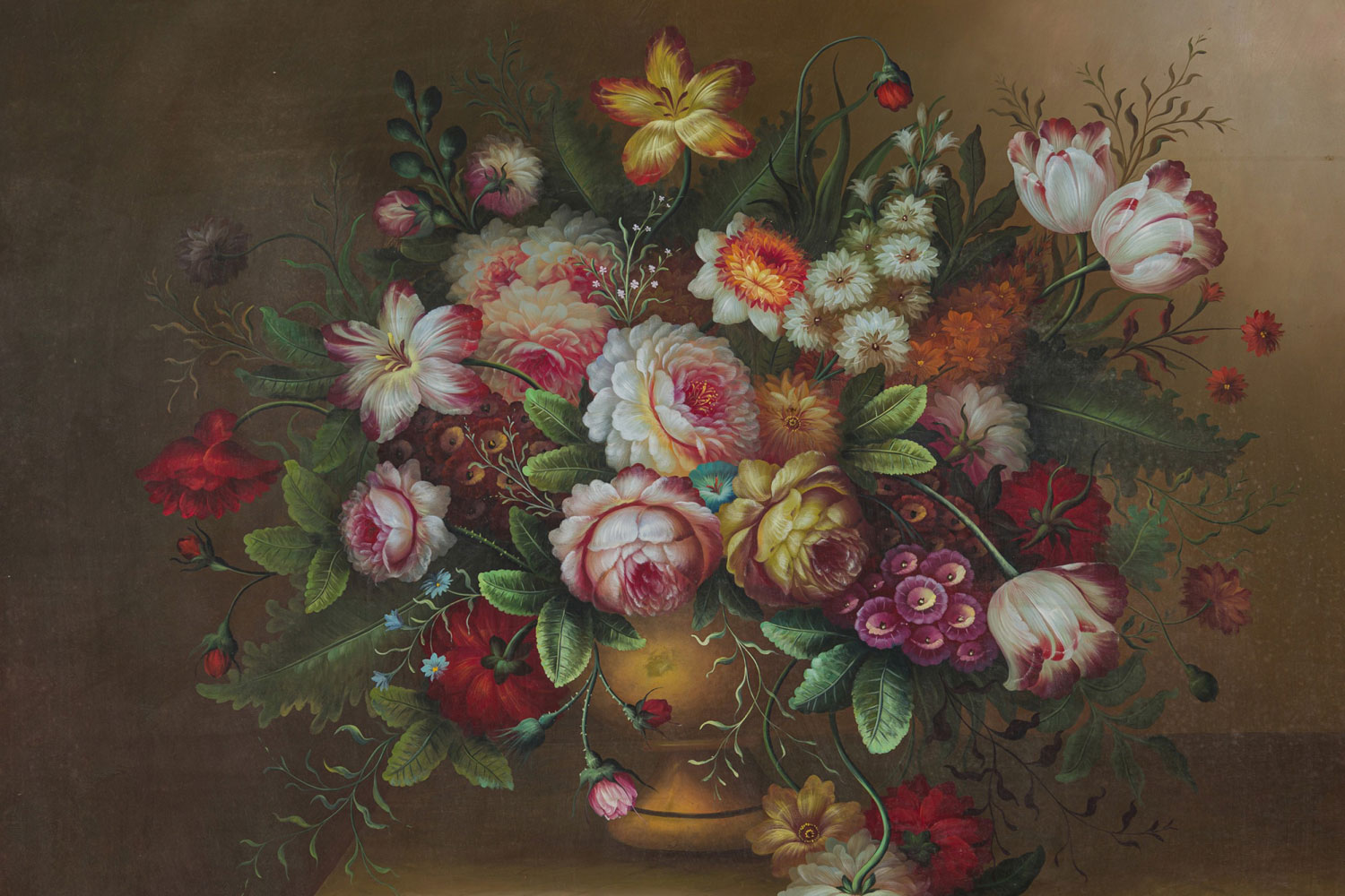 French victorian style still life featuring a bouquet of flowers in a gold vase with a 5 leaf yellow flower resembling a star in floral coloured oils on canvas in a gilt frame