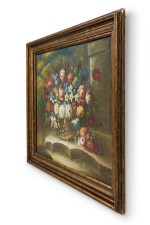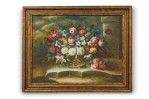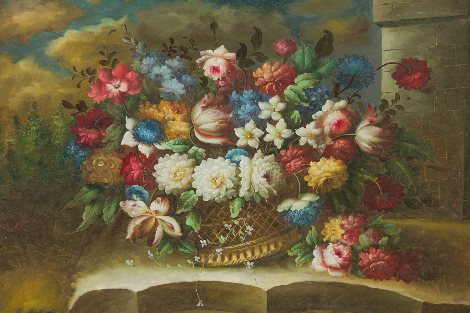 French victorian style still life painting of a floral bouquet in a woven vase tilted on a broken concrete platform with a clouded sky in the background, oil on canvas in a gilt painted and beveled frame