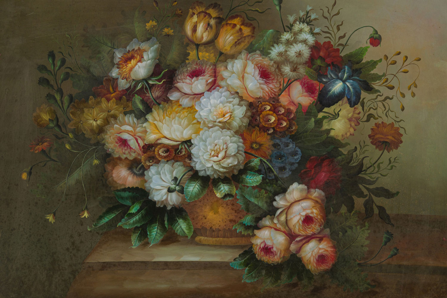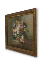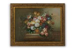 French victorian style still life painting of a floral bouquet in a golden vase near the edge of a table, oil on canvas in a gilt painted frame.