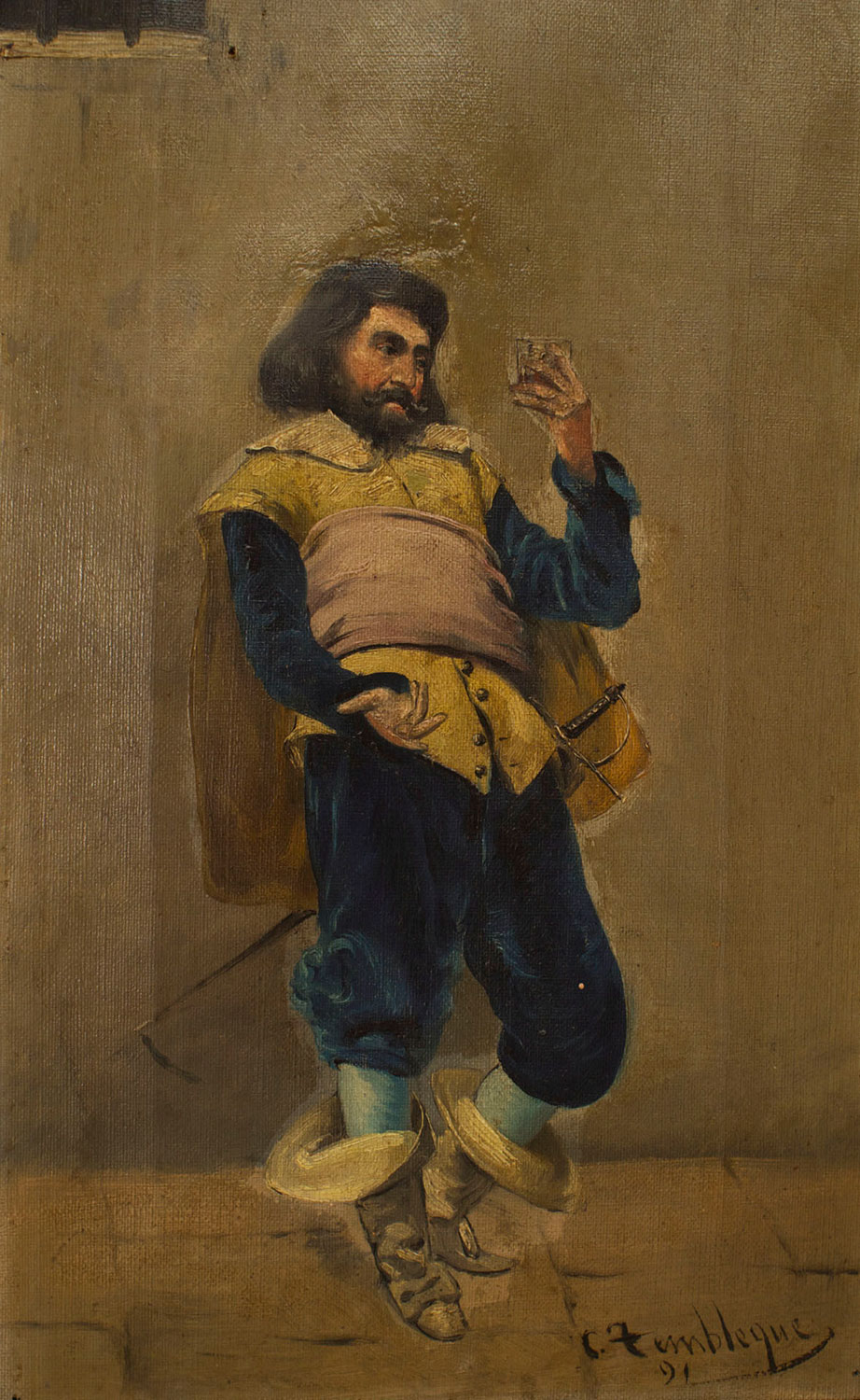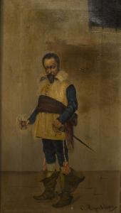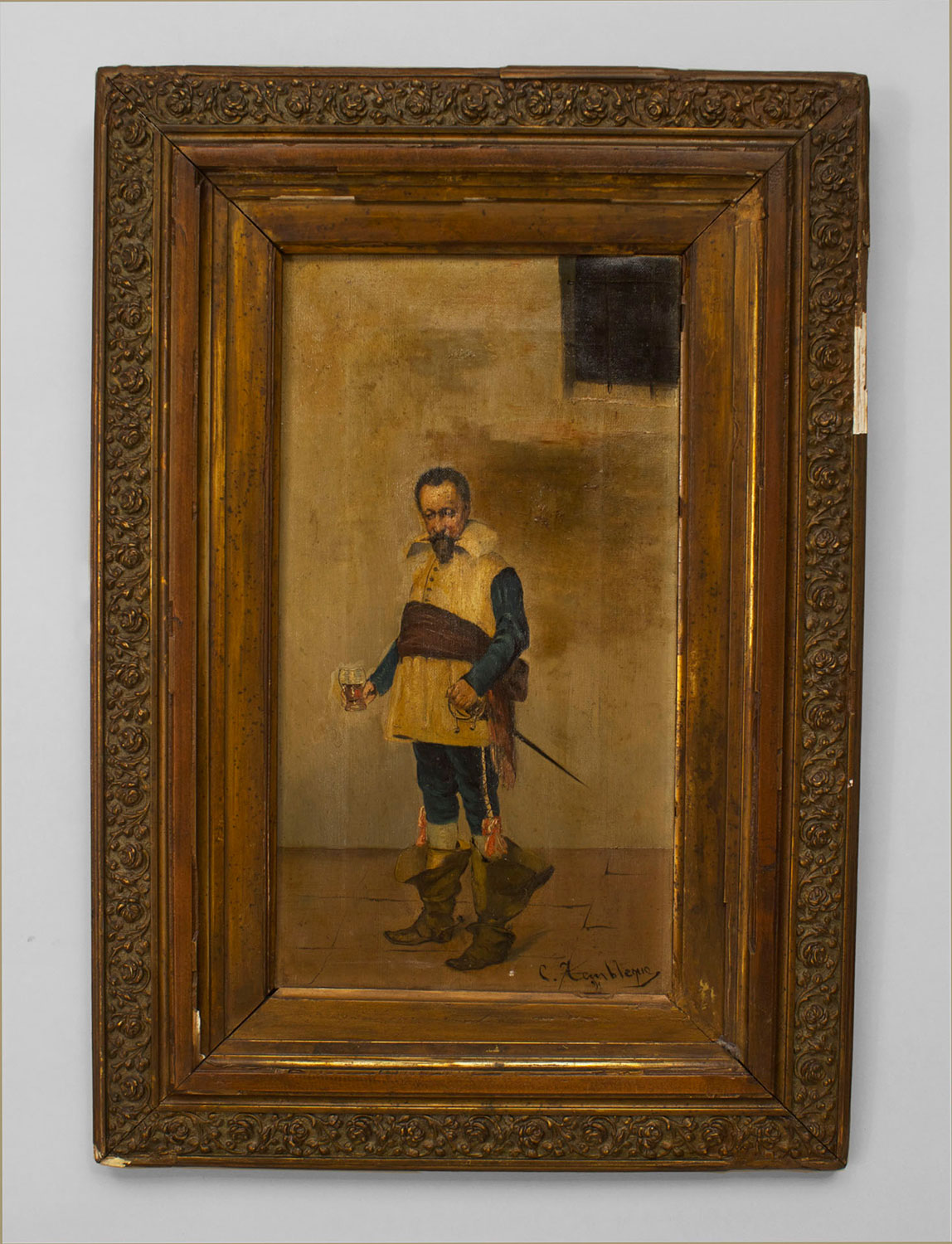 PAIR of French Victorian (19th Cent) oil on canvas paintings of standing cavaliers in gilt frames (sgnd: C. Fembleque)