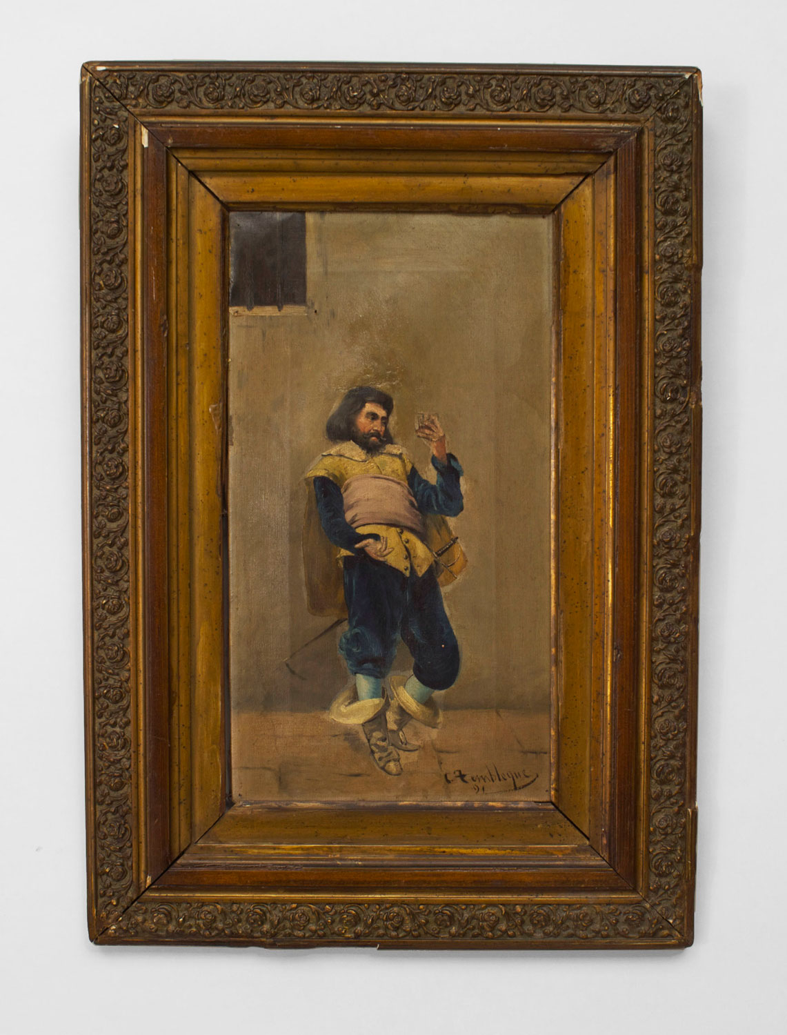 PAIR of French Victorian (19th Cent) oil on canvas paintings of standing cavaliers in gilt frames (sgnd: C. Fembleque).