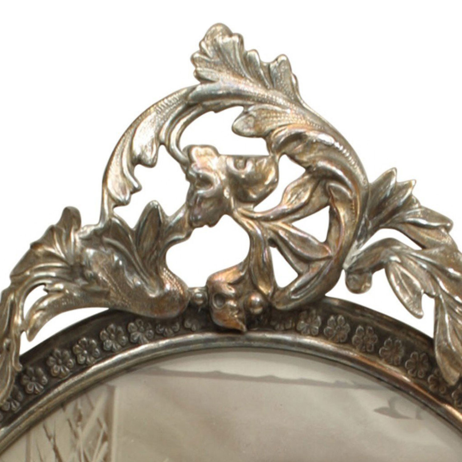 French Victorian-style (19/20th Century) oval embossed silver-plate ease picture frame with floral filigree pediment..