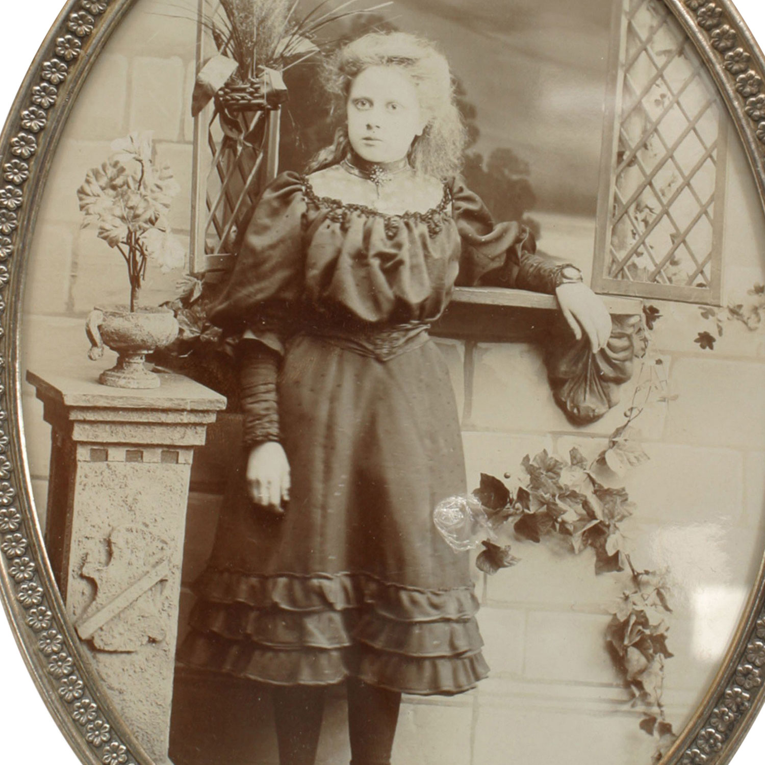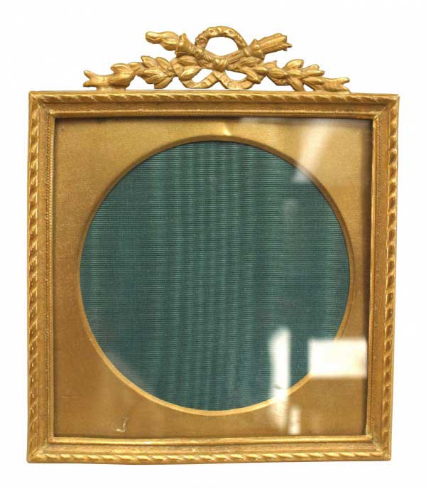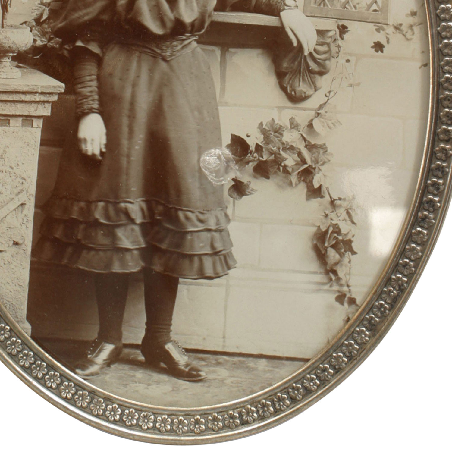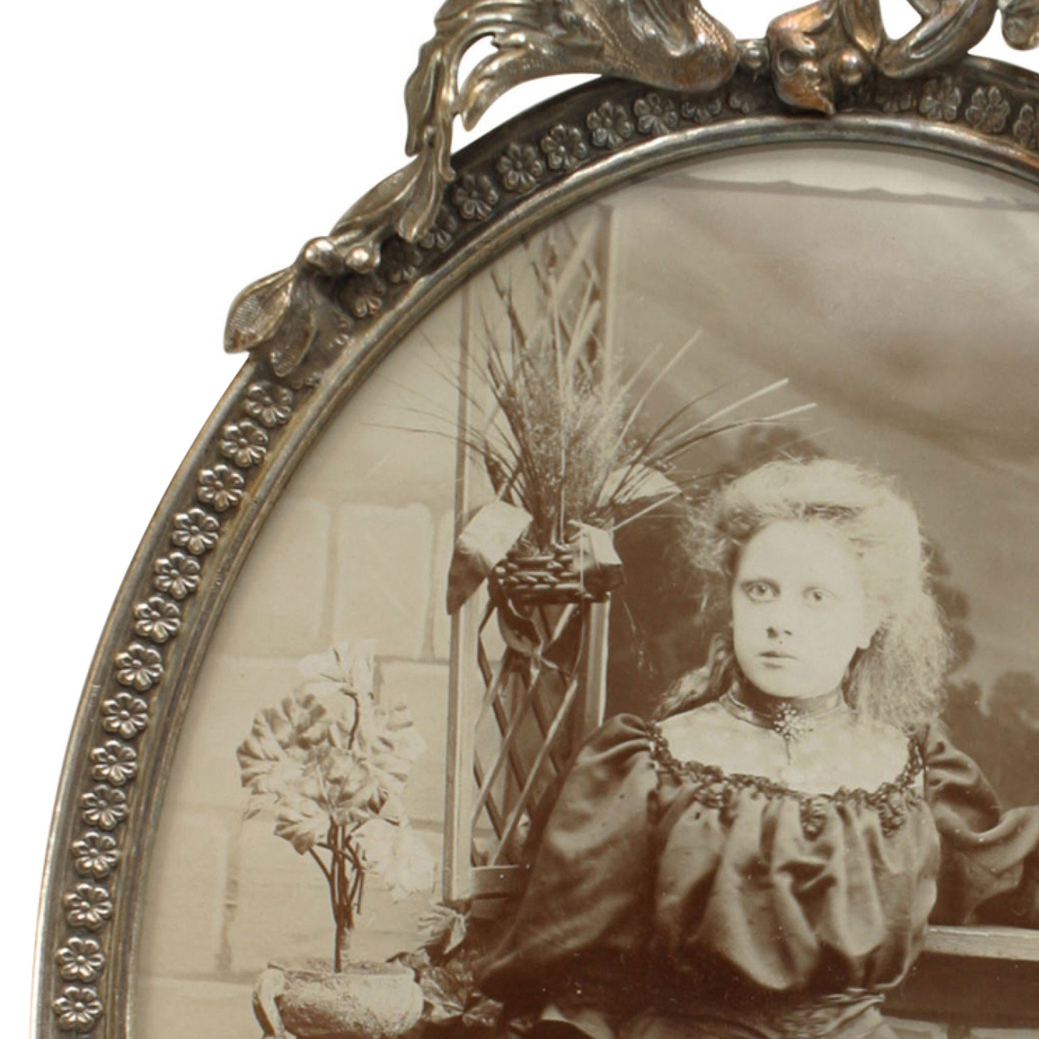 French Victorian-style (19/20th Century) oval embossed silver-plate ease picture frame with floral filigree pediment.