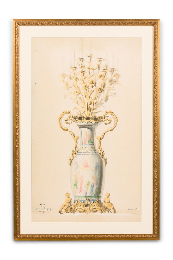 French Victorian style still life painting of a bouquet of flowers in a white urn in a black and gilt carved frame.