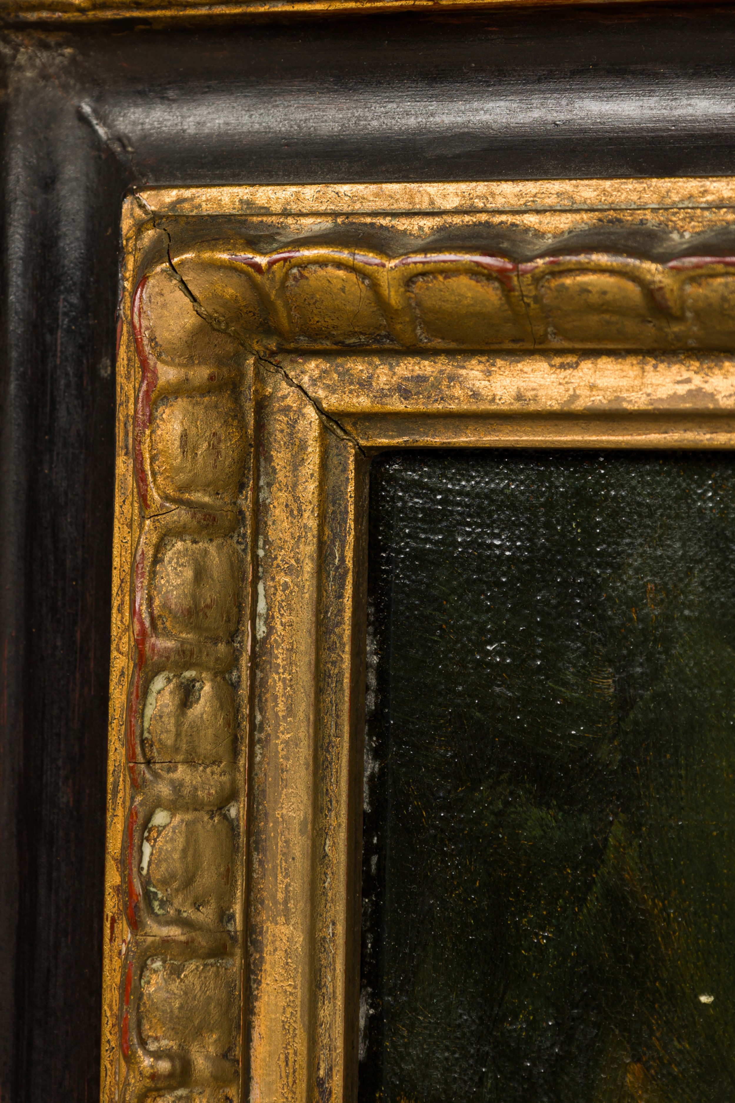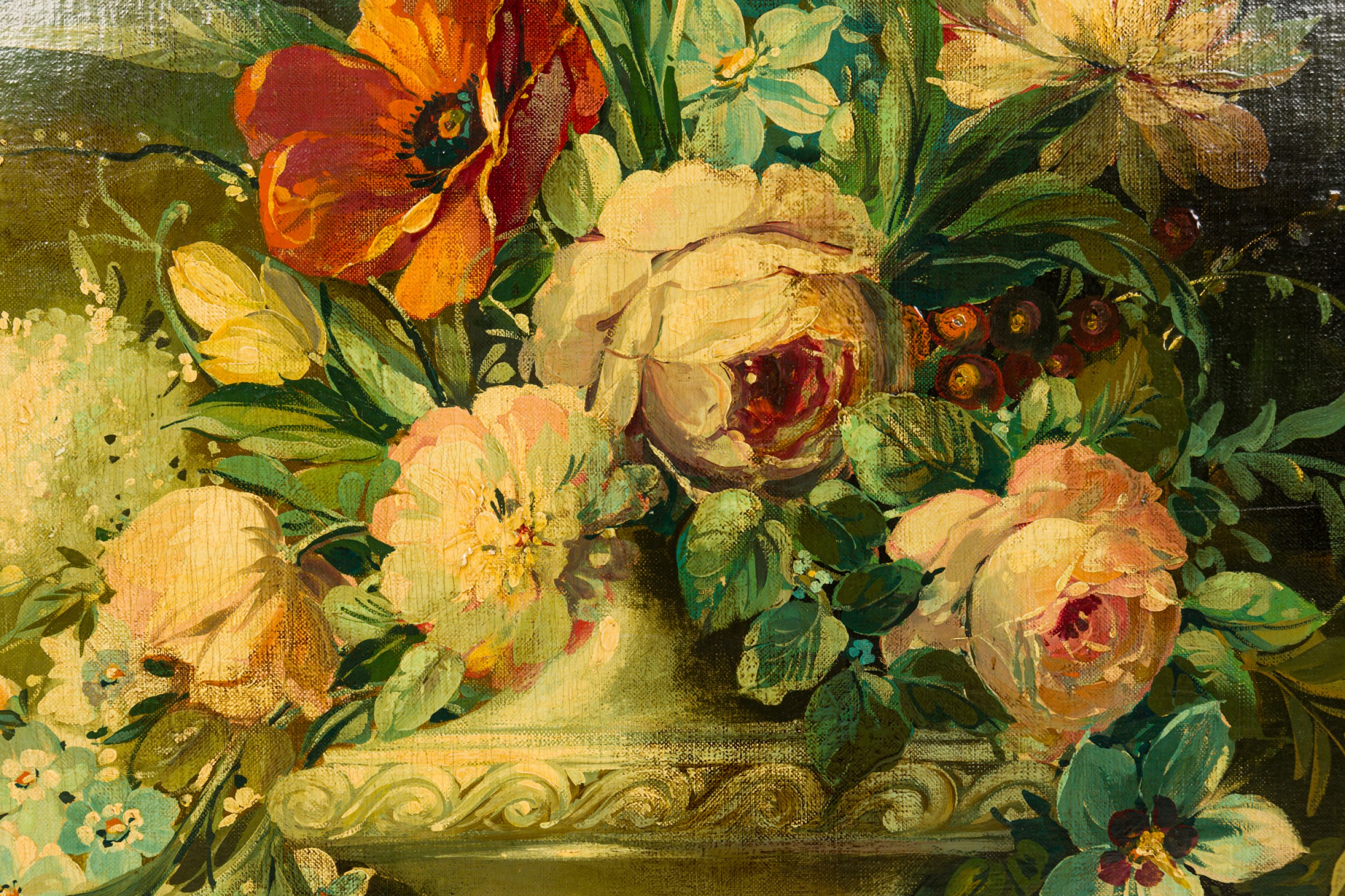 French Victorian style still life painting of a bouquet of flowers in a white urn in a black and gilt carved frame