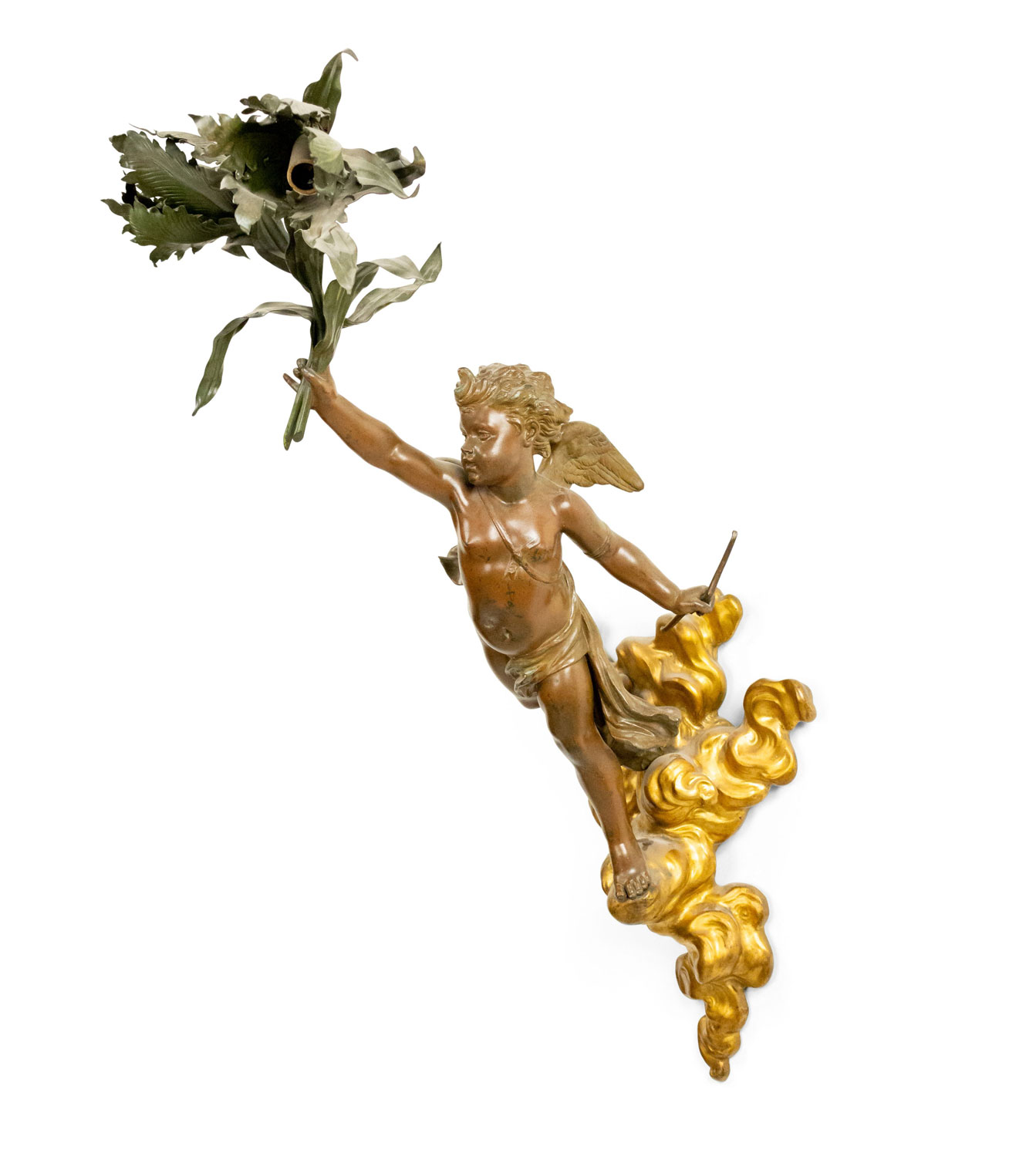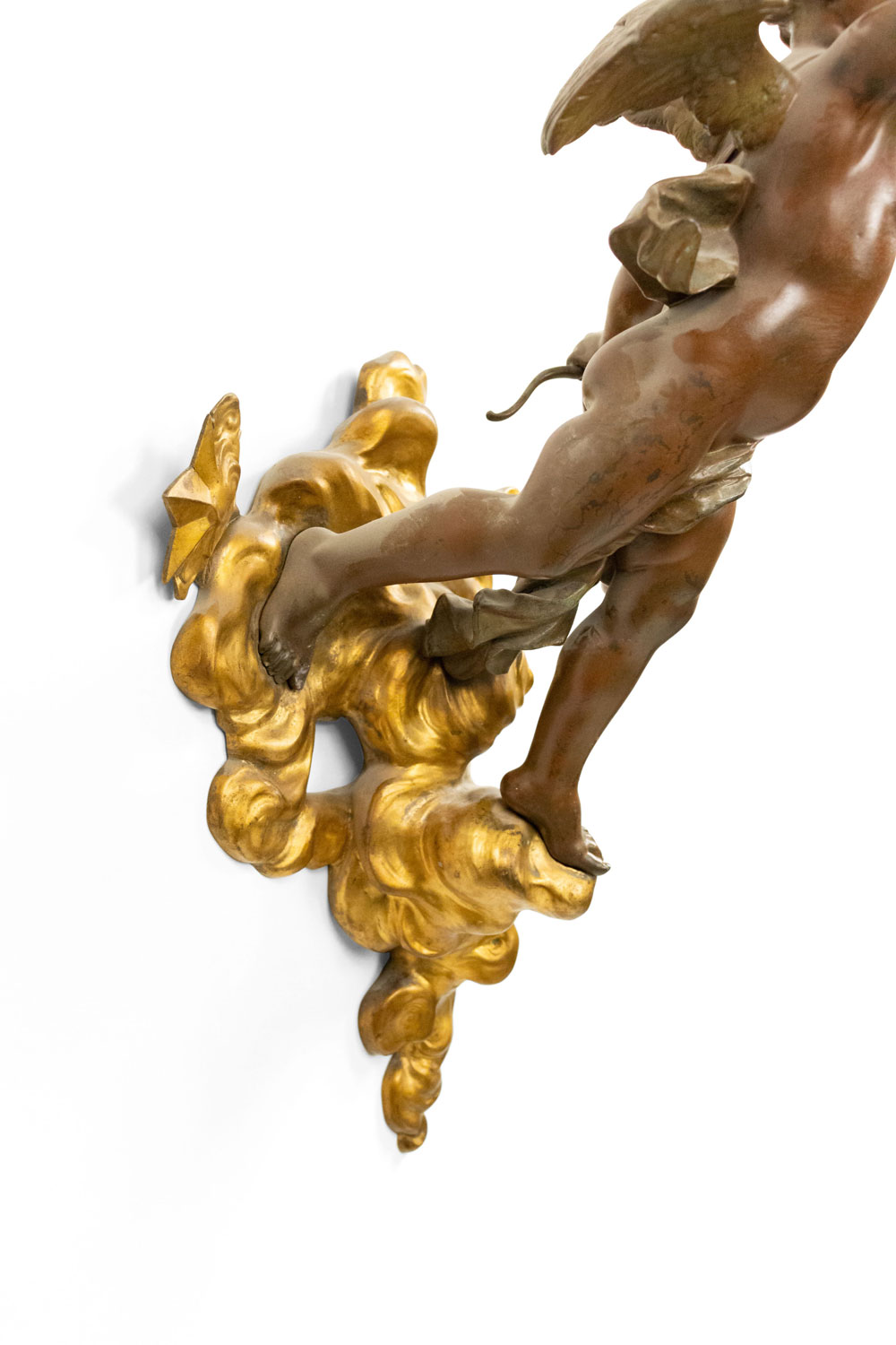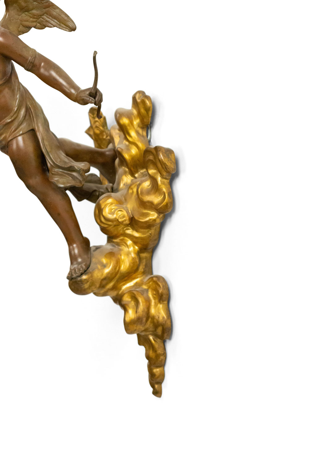 PAIR of French Victorian patinated metal wall sconces with cupid figures holding two floral design lights supported on a bronze dore cloud. (PRICED AS PAIR).