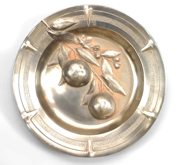 PAIR of French Victorian pewter round wall plates with fruit in relief. (signed ERMENAULT) (PRICED AS PAIR)..