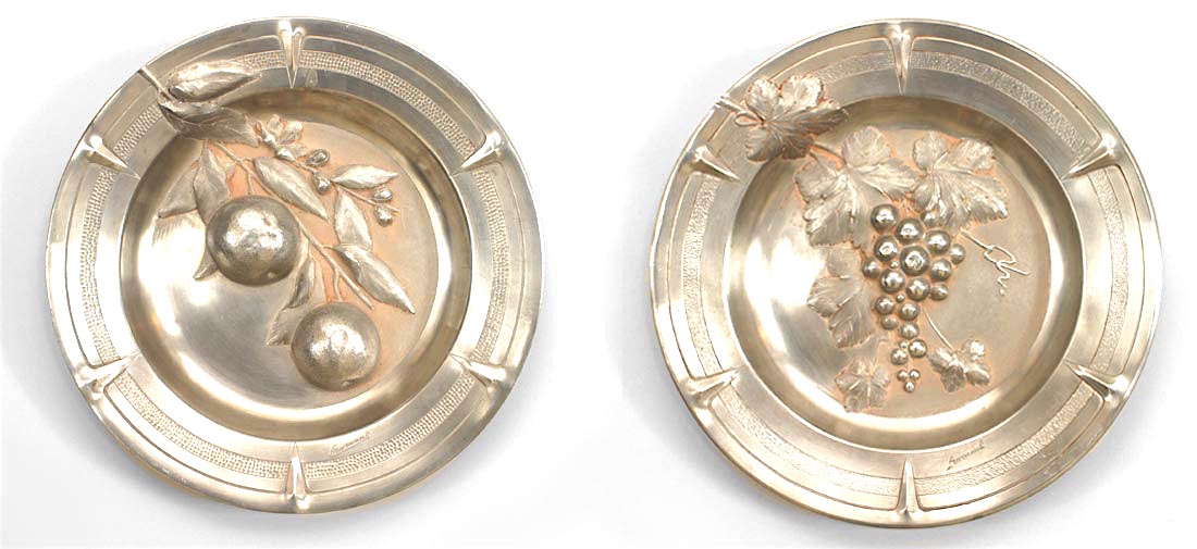 PAIR of French Victorian pewter round wall plates with fruit in relief. (signed ERMENAULT) (PRICED AS PAIR).