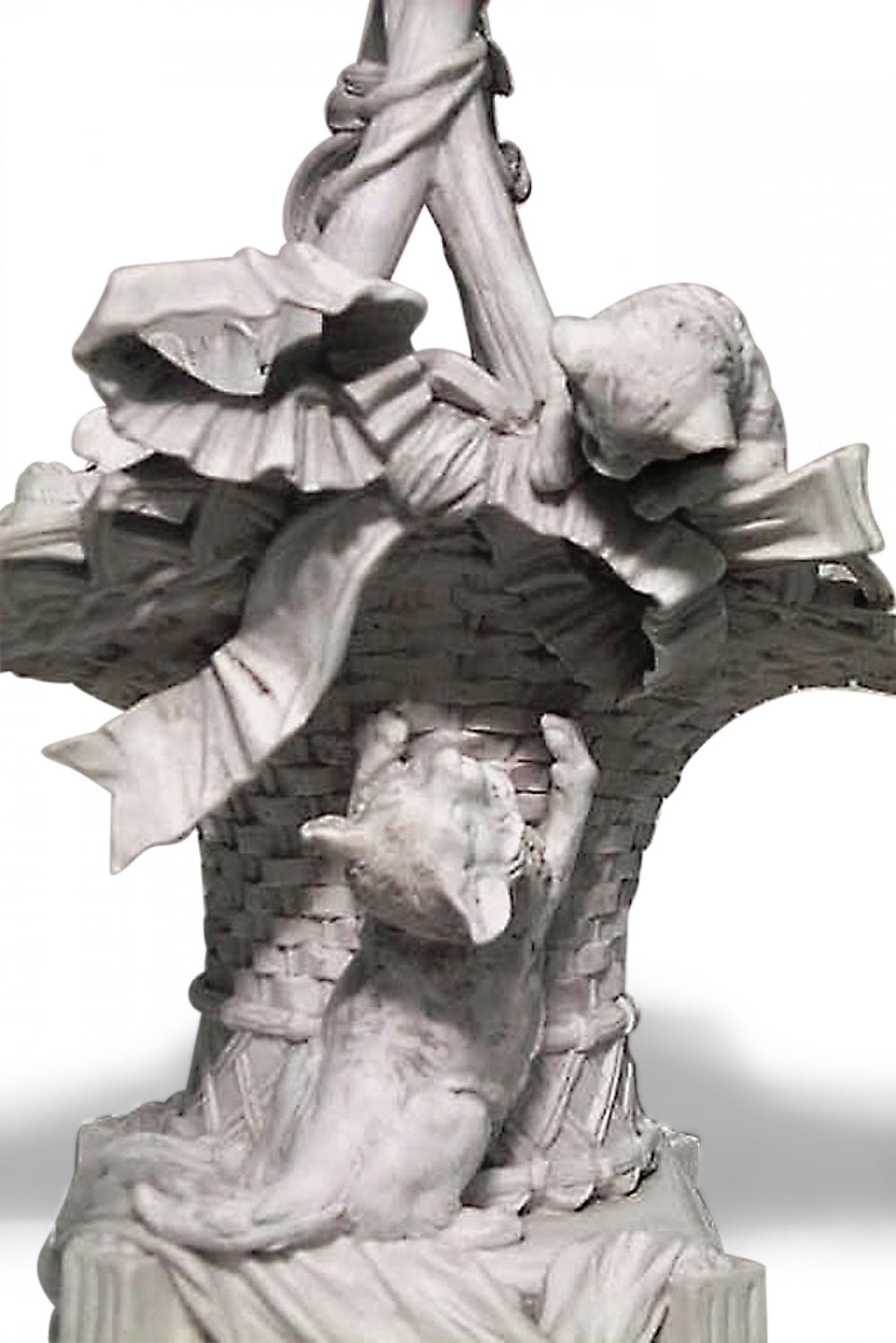 French Victorian white parian porcelain centerpiece with 2 cats climbing on basket with handle and floral trim
