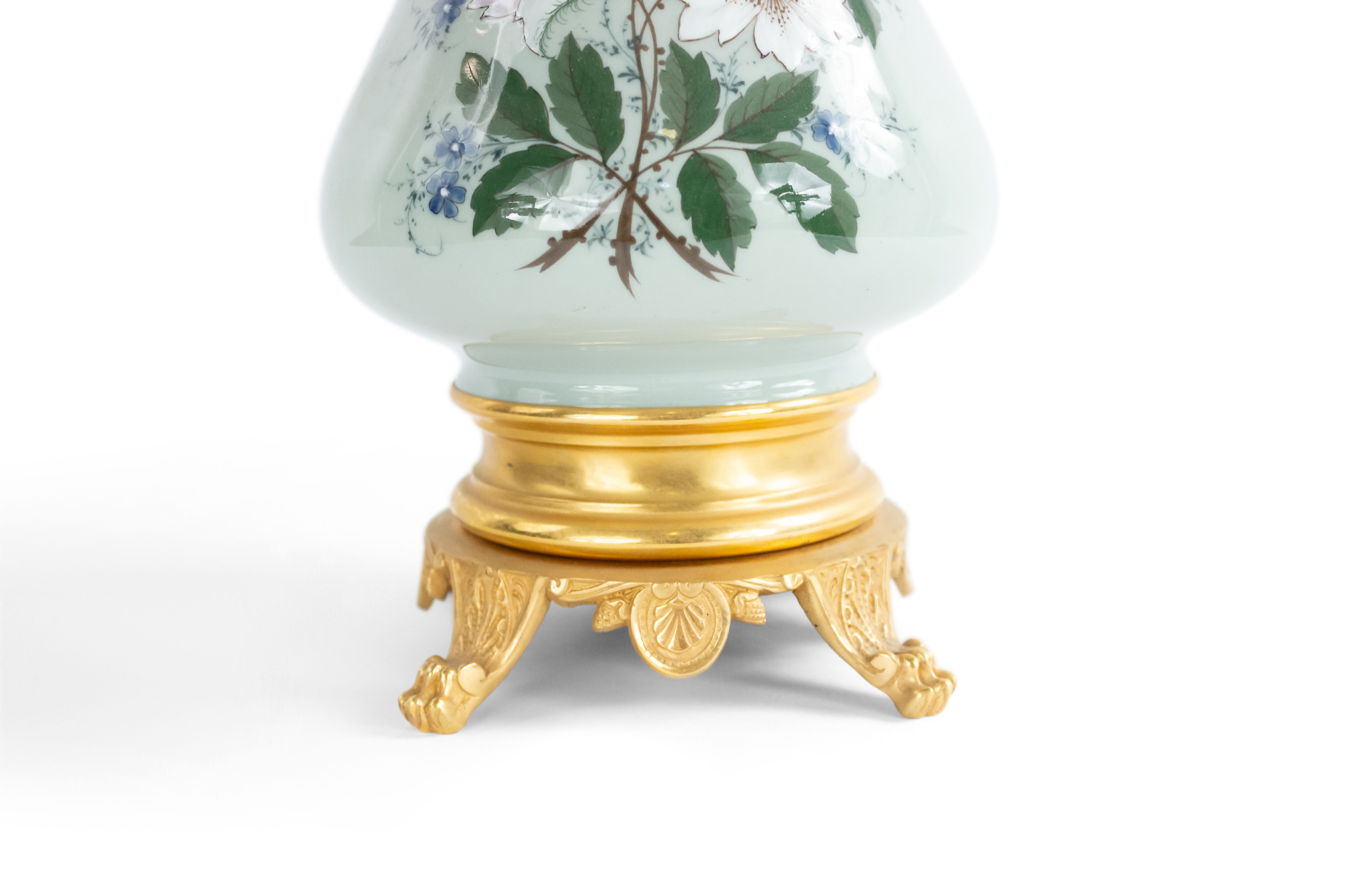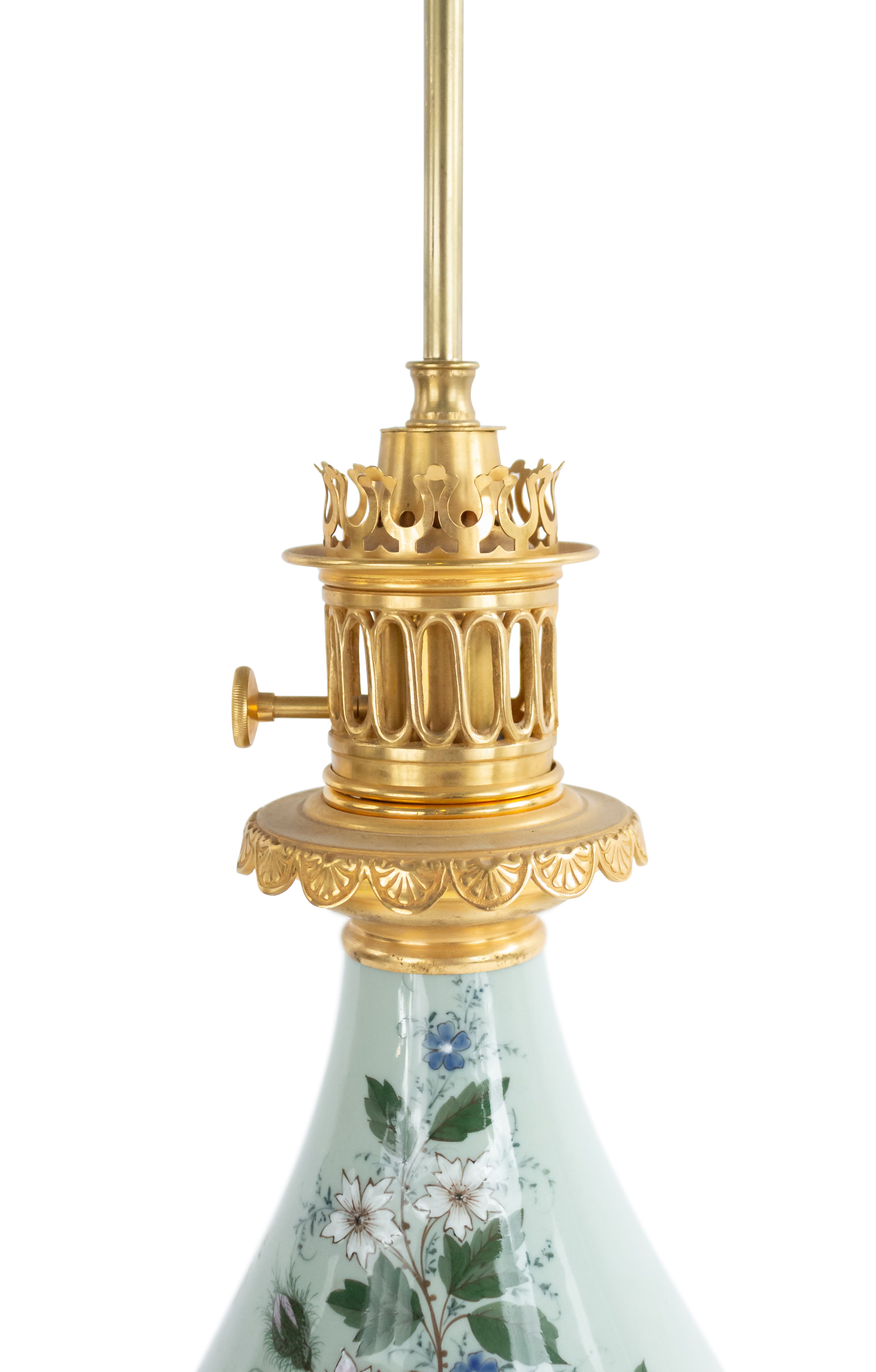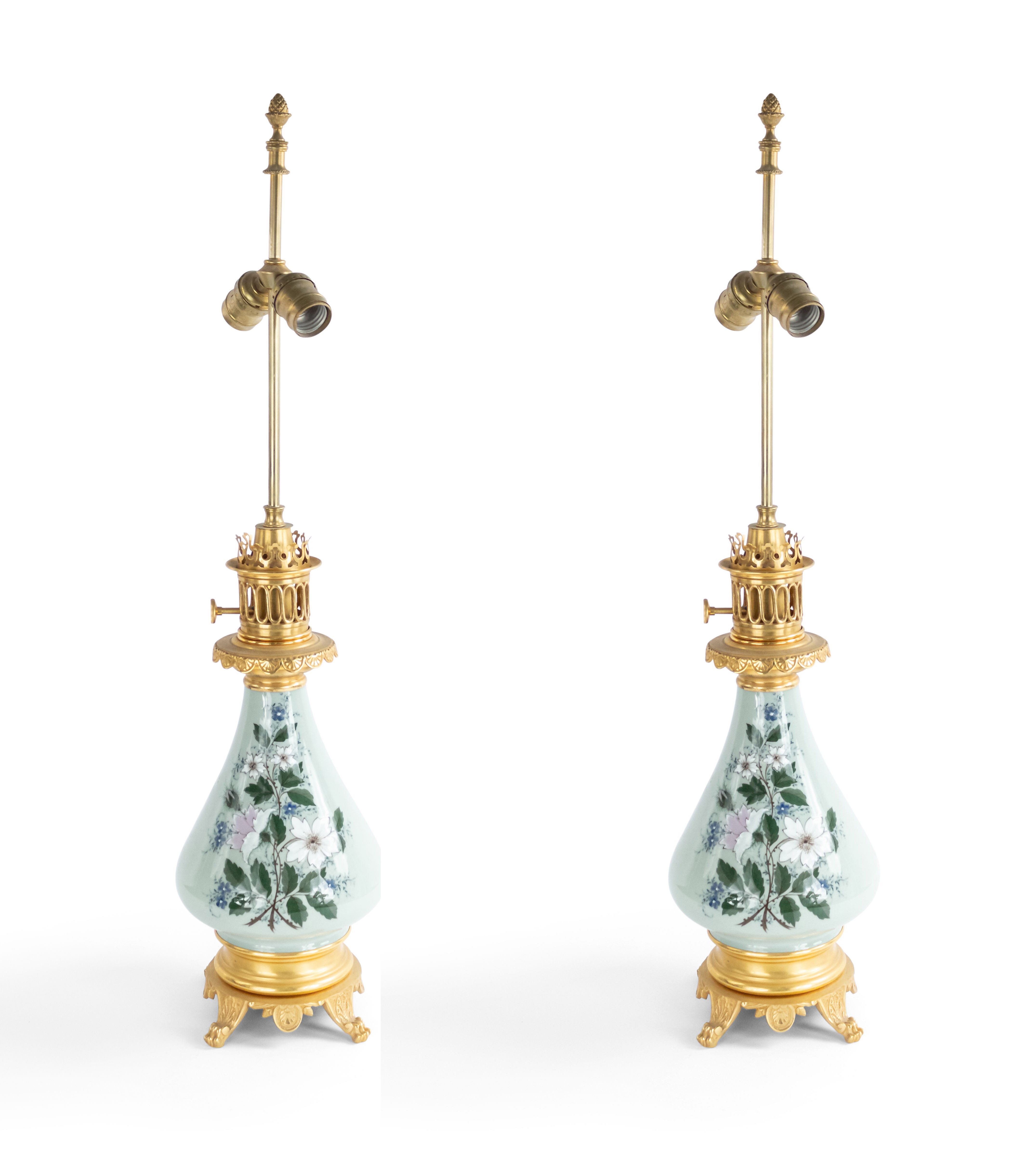 PAIR of French Victorian porcelain pate-su-pate celadon lamps with floral decoration and gilt bronze base and trim. (Originally oil now wired for electric)(PRICED AS PAIR)..