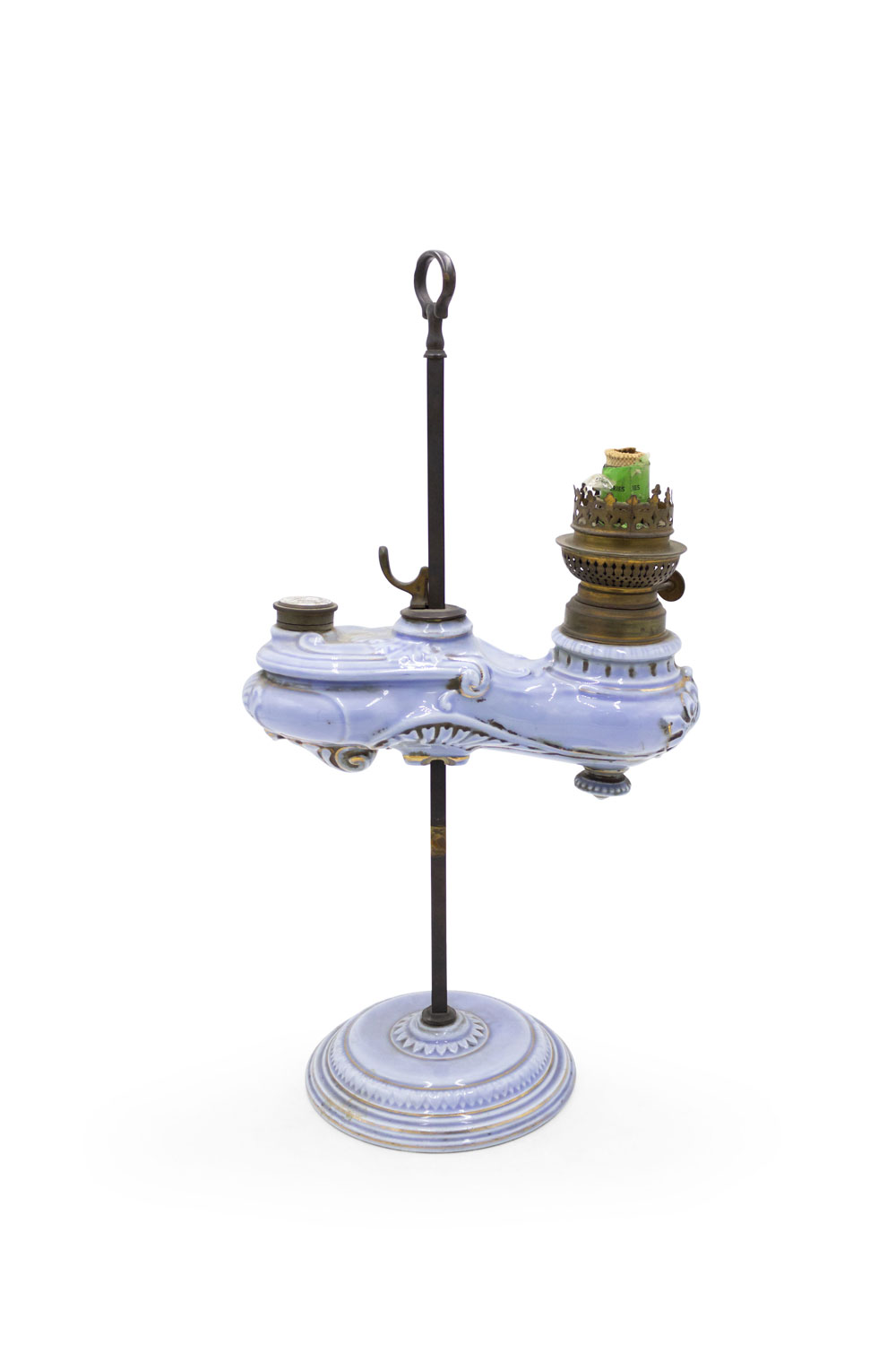 French Victorian blue porcelain Aladdin style oil table lamp.