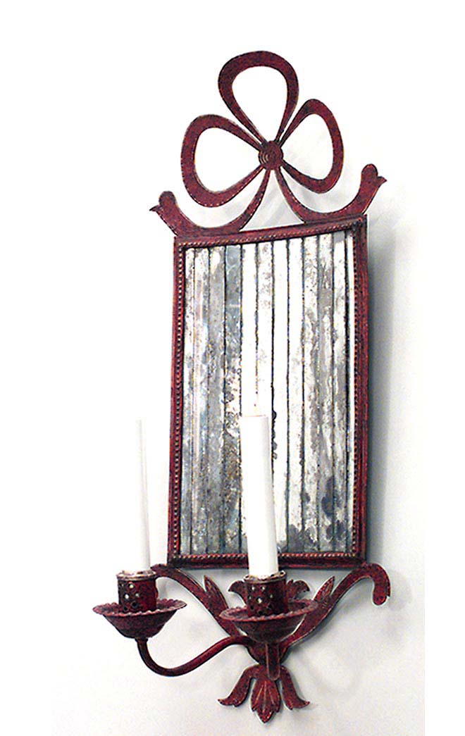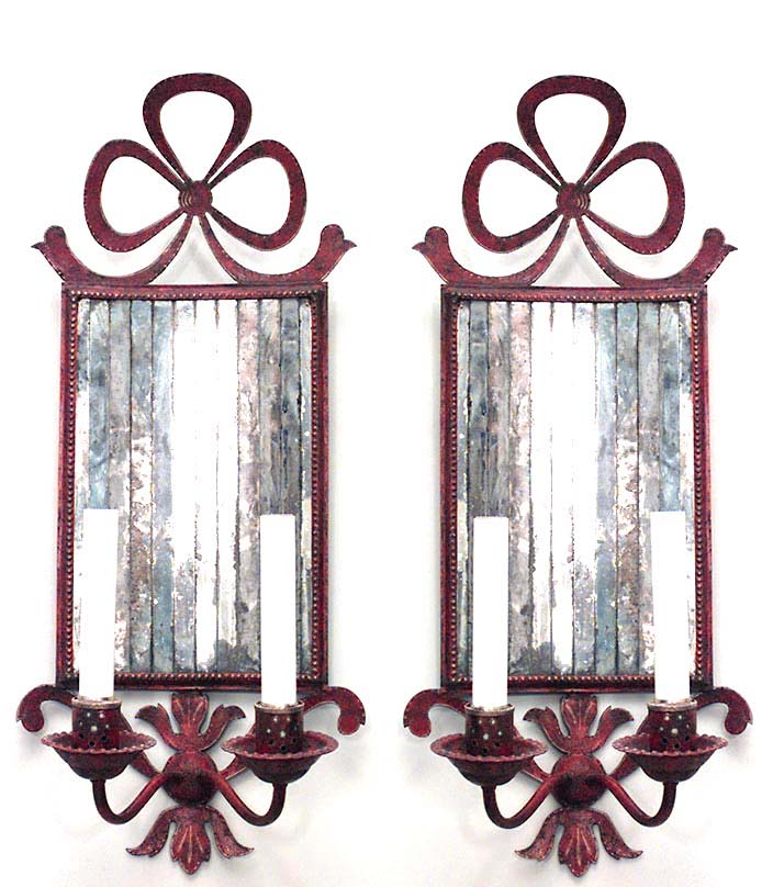 PAIR of French Victorian-style (20th Century) wall sconces with two arms, red tole bow knots, and mirrored backs. (PRICED AS PAIR).