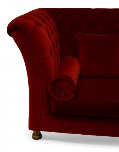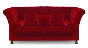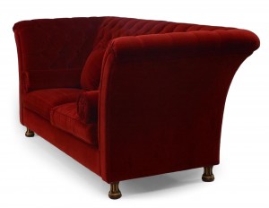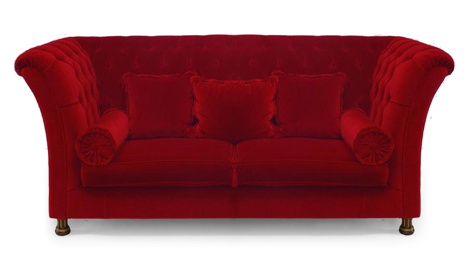 French Victorian style (modern) red tufted velvet settee with square back & side arms with 2 seat & bolster cushions and 3 loose back cushions standing on fluted gilt & walnut legs.