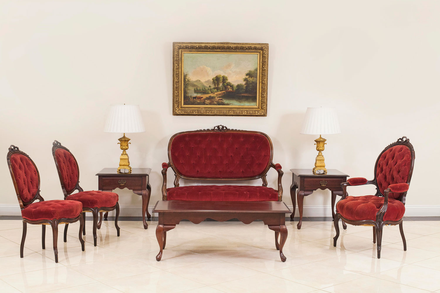 SET of 5 French Victorian rosewood salon set with tufted red velvet upholstery (settee: 52"w 24"d 43"h, 2 arm chairs: 24"w 27"d 41"h, 2 side chairs)