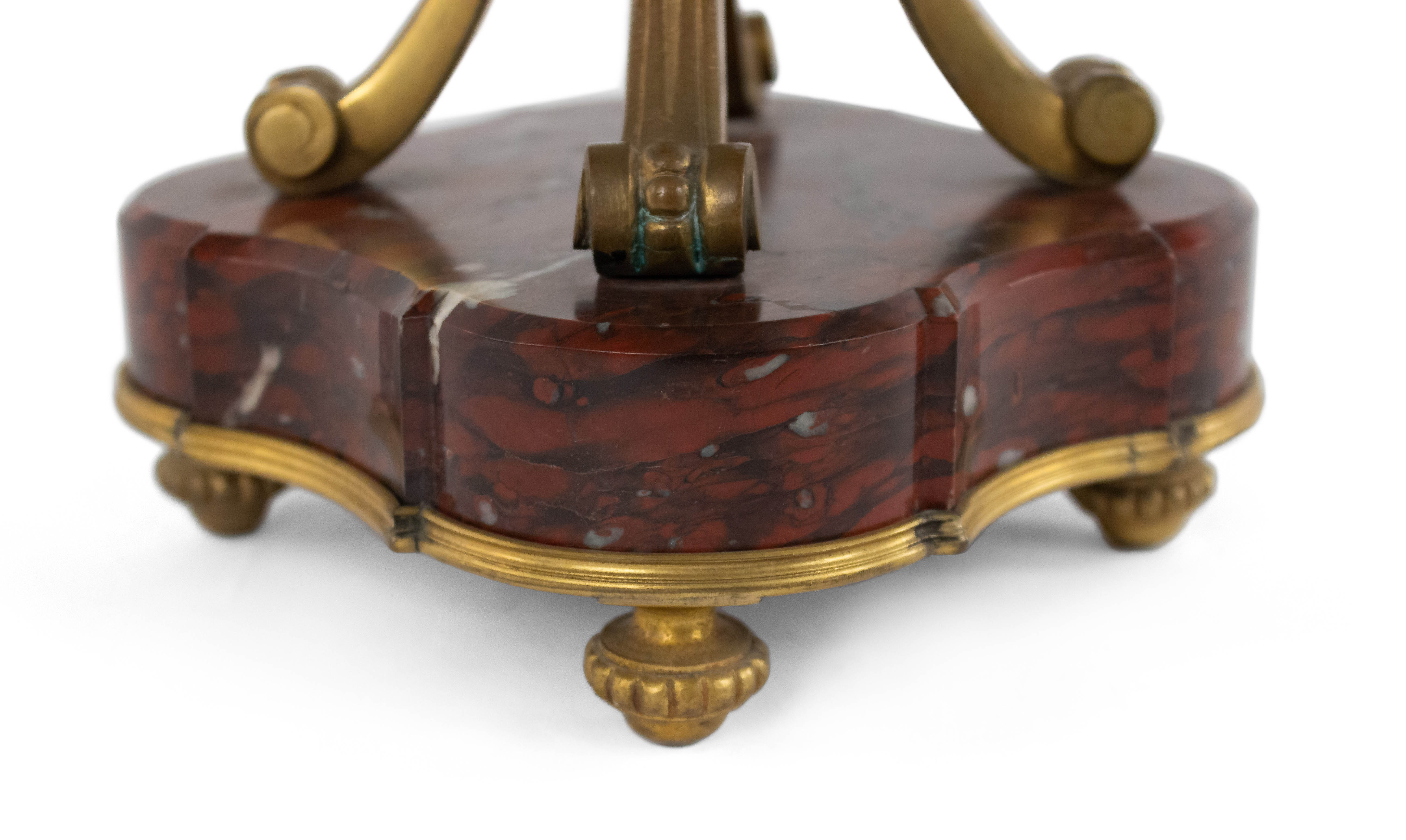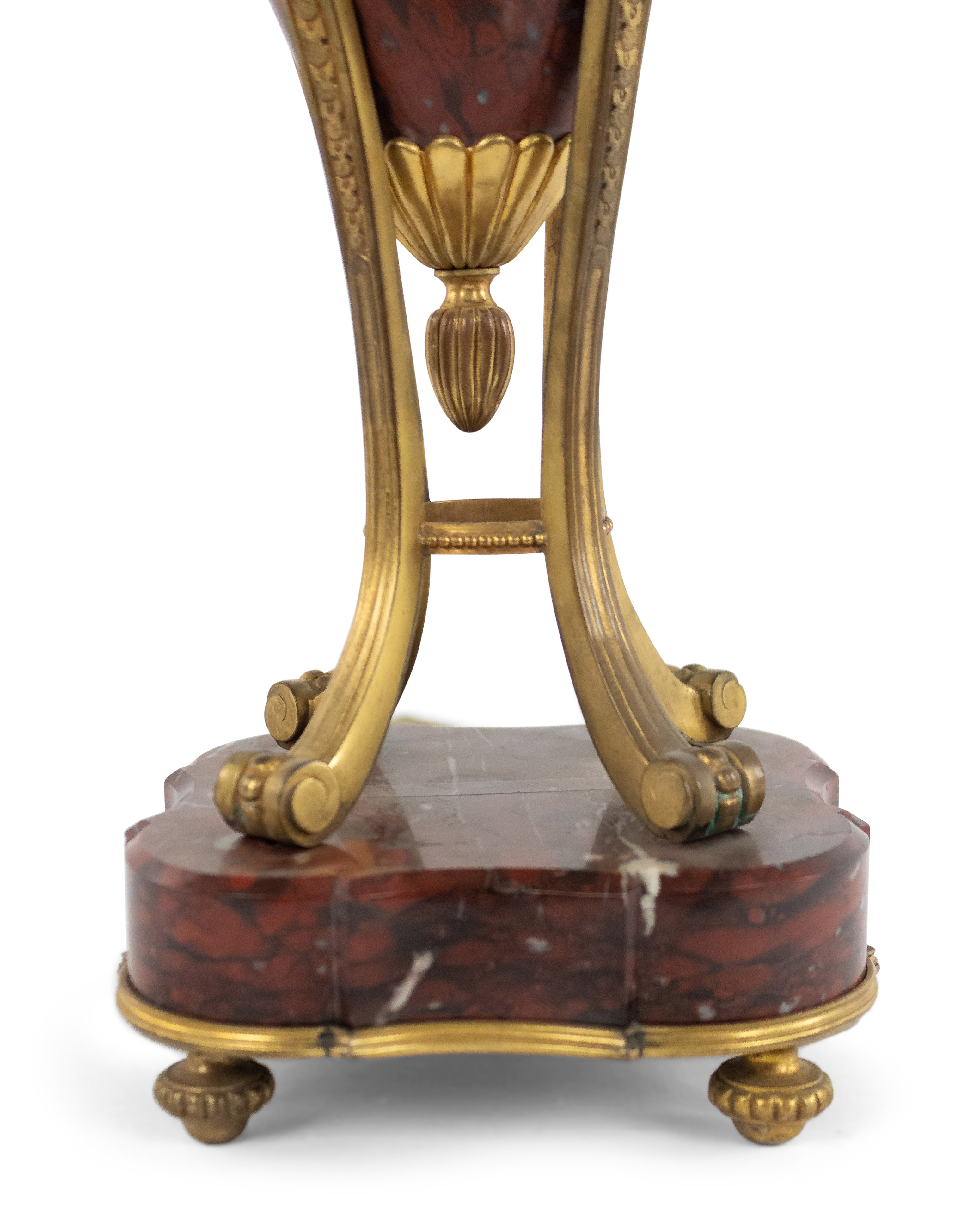 French Victorian-style (19th Century) rouge marble urn table lamp with extensive bronze mounts, culminating in scrolled feet on a square shaped marble base.