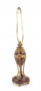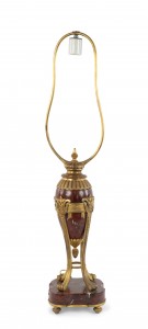 French Victorian-style (19th Century) rouge marble urn table lamp with extensive bronze mounts, culminating in scrolled feet on a square shaped marble base..