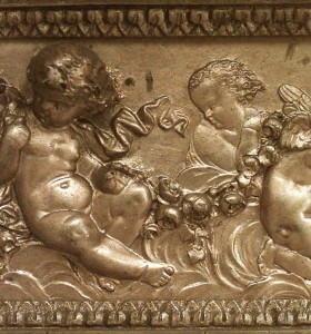 French Victorian satinwood and bronze trimmed sideboard cabinet with 2 inlaid doors and round glass side doors.