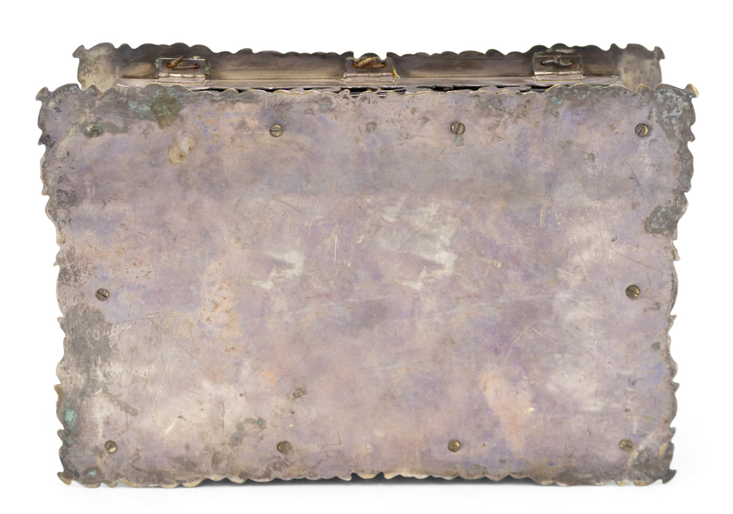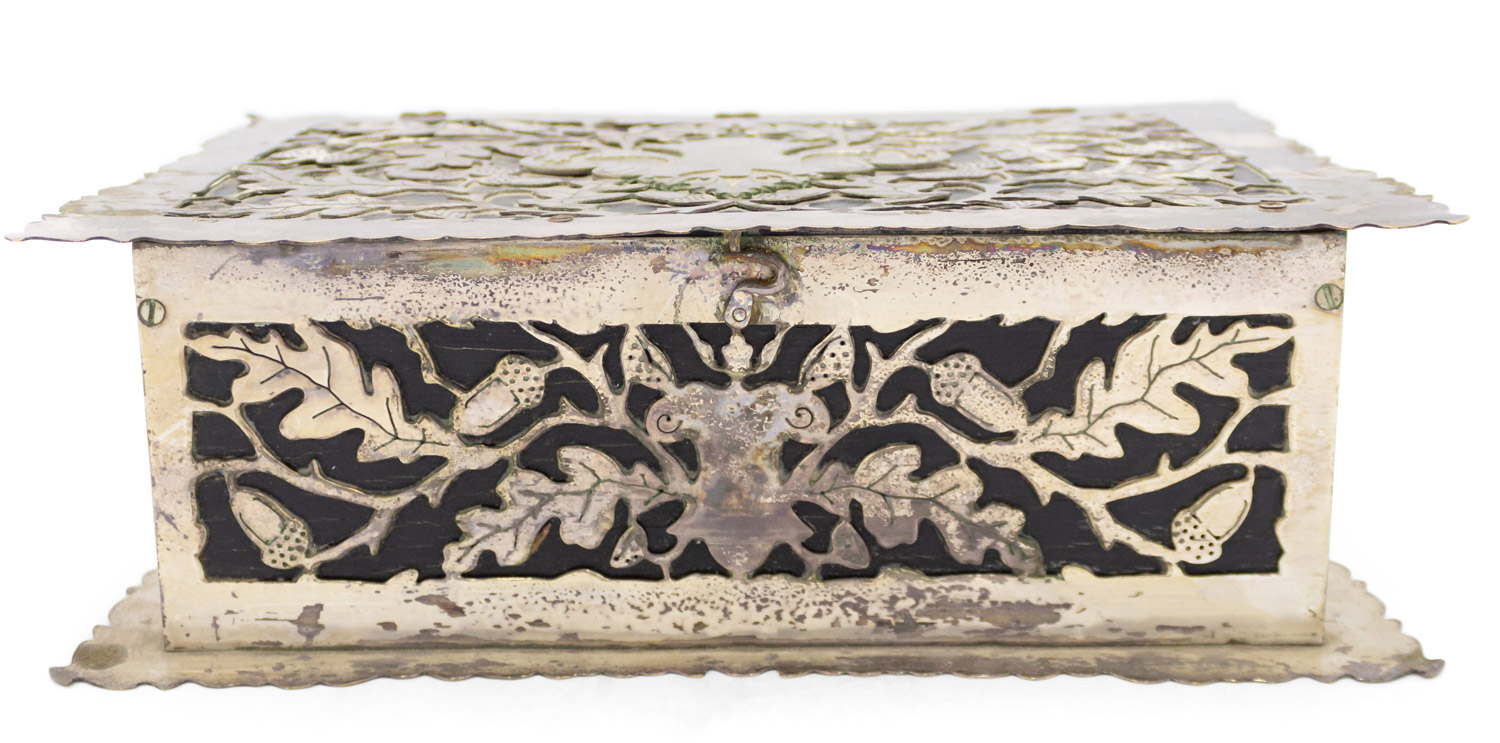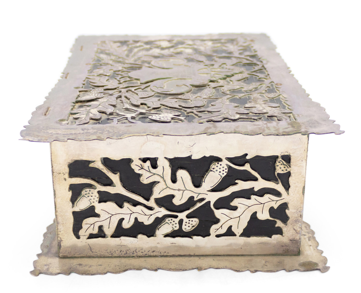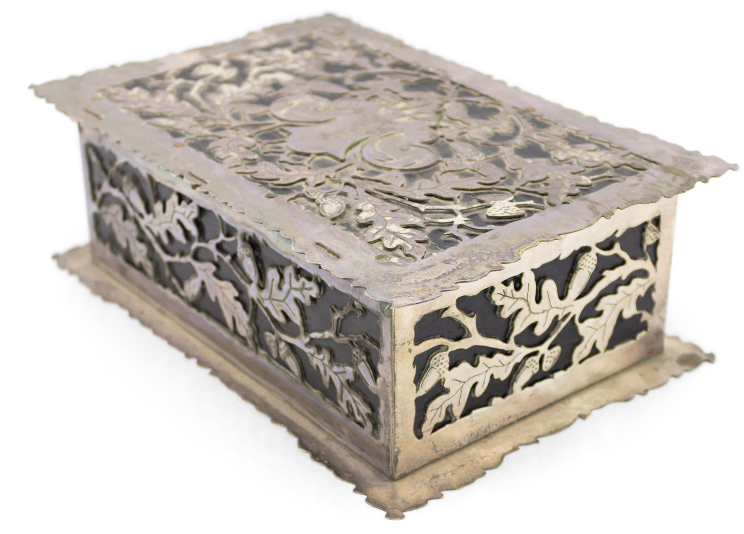 French Victorian silver plate floral and acorn filigree humidor box with scalloped edge.