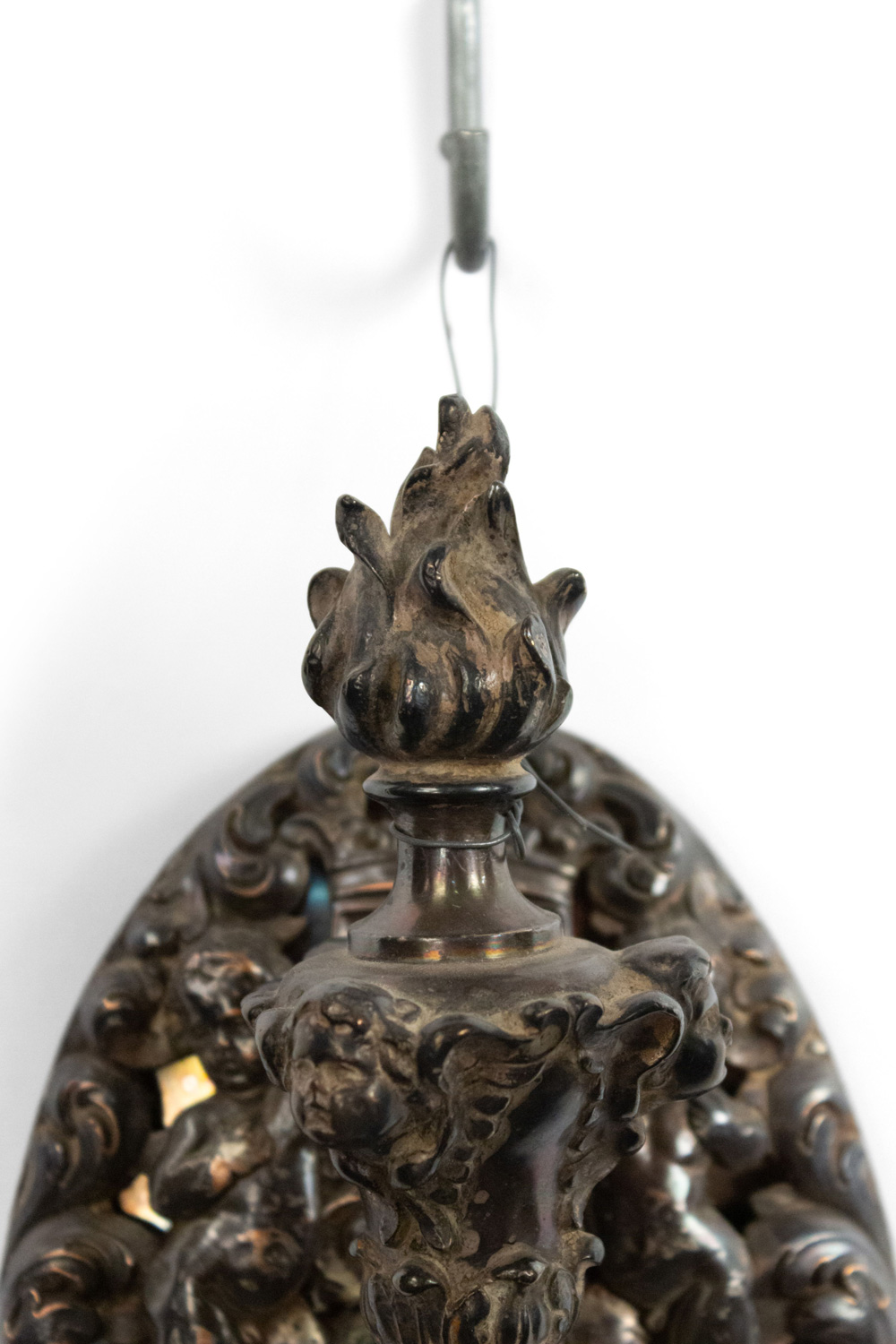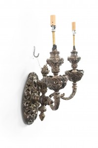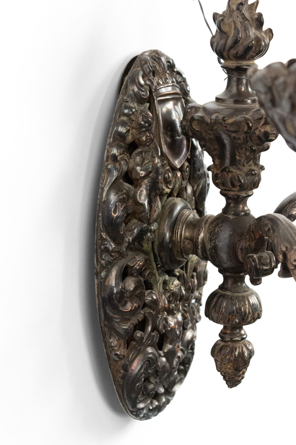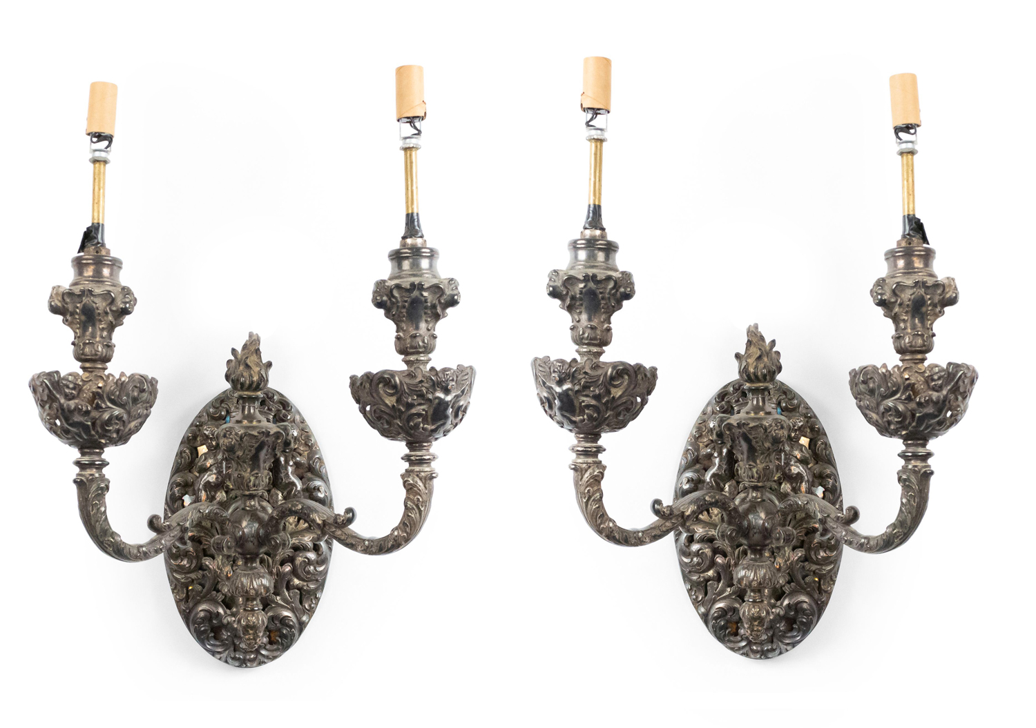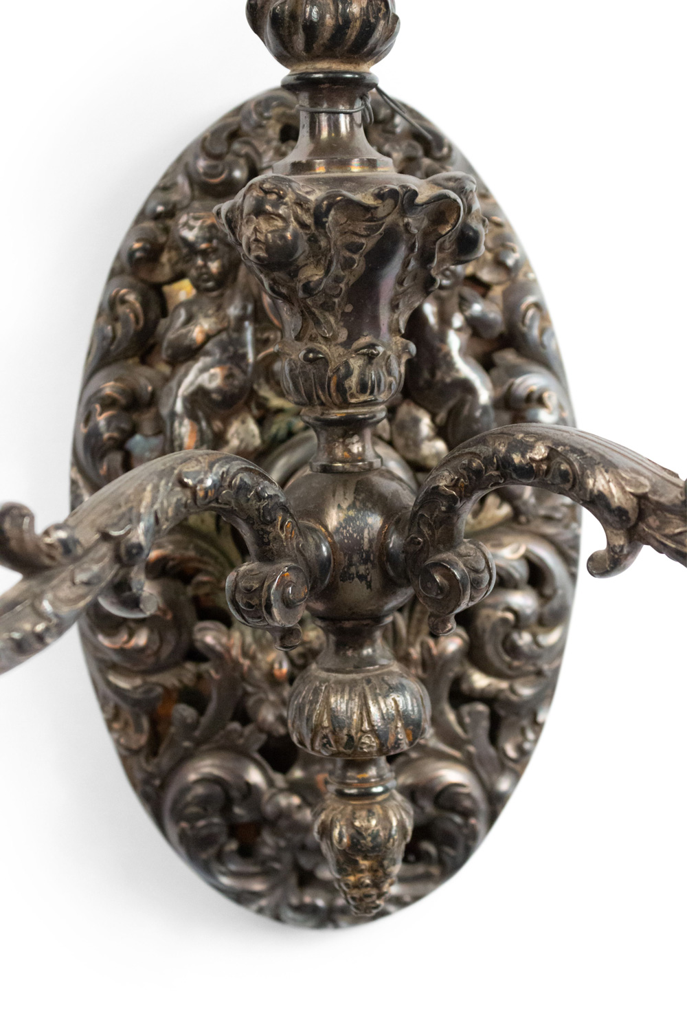PAIR of French Victorian silver plate wall sconces with two arms, scroll and filigree designs, flame finial tops, and cupid head ornaments (PRICED AS PAIR)