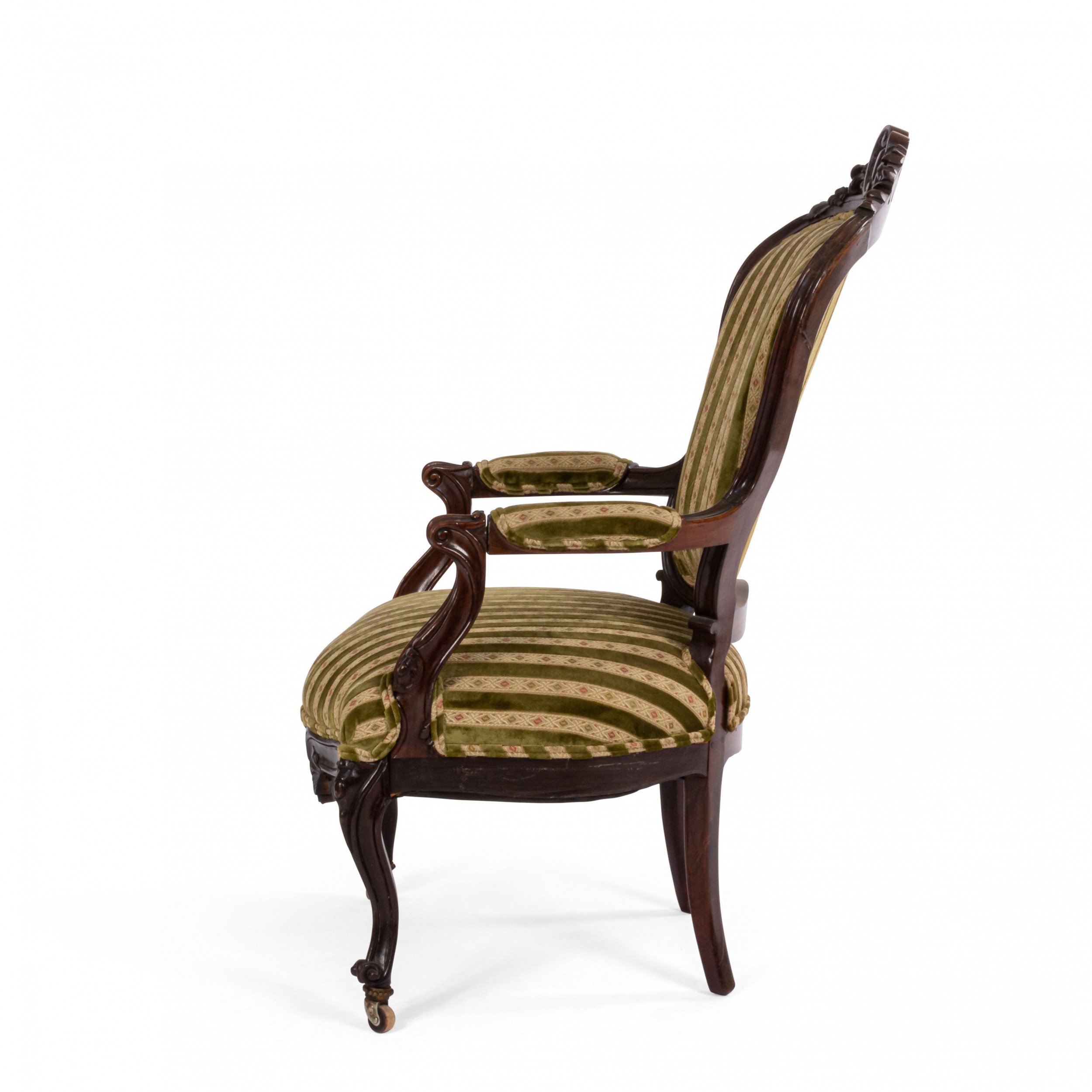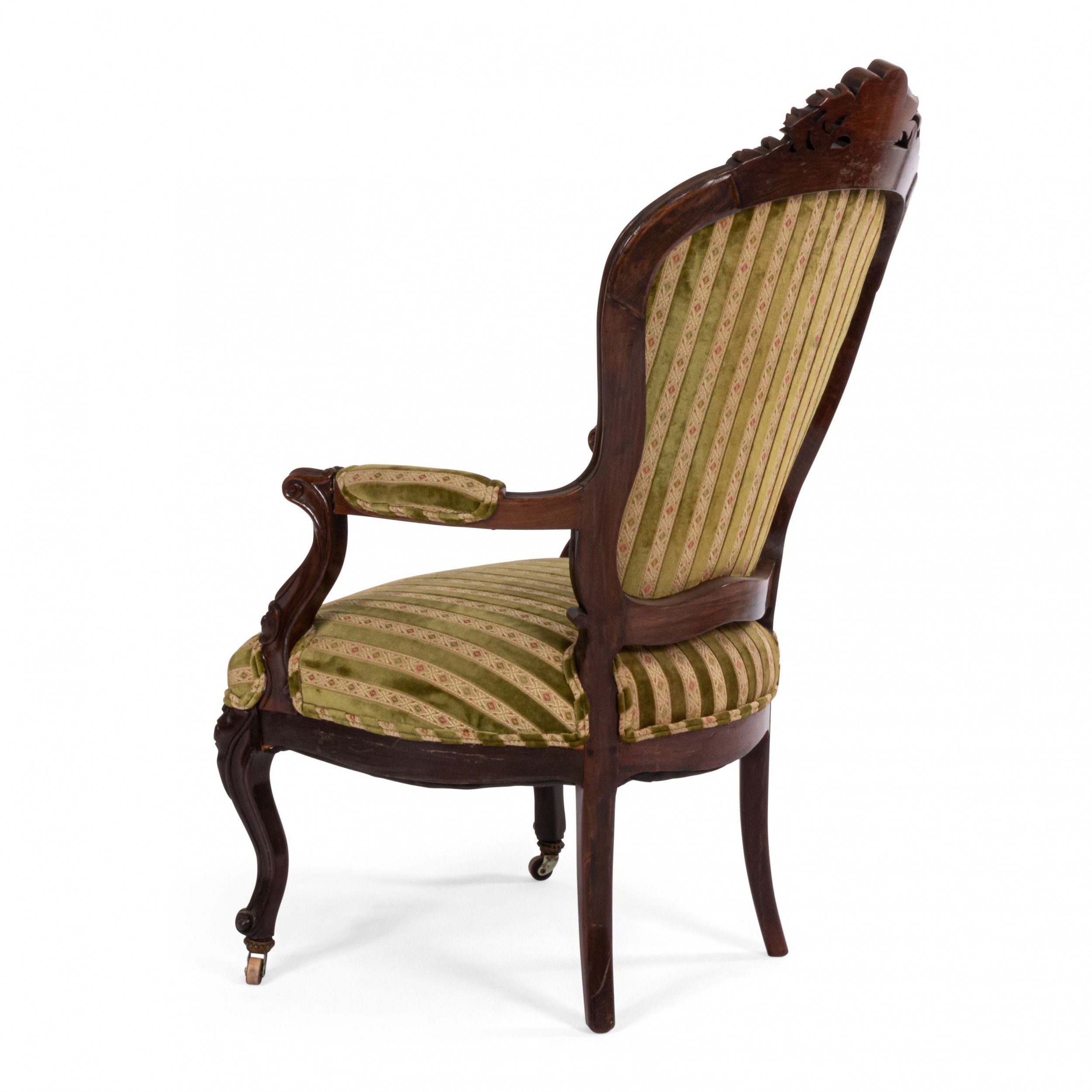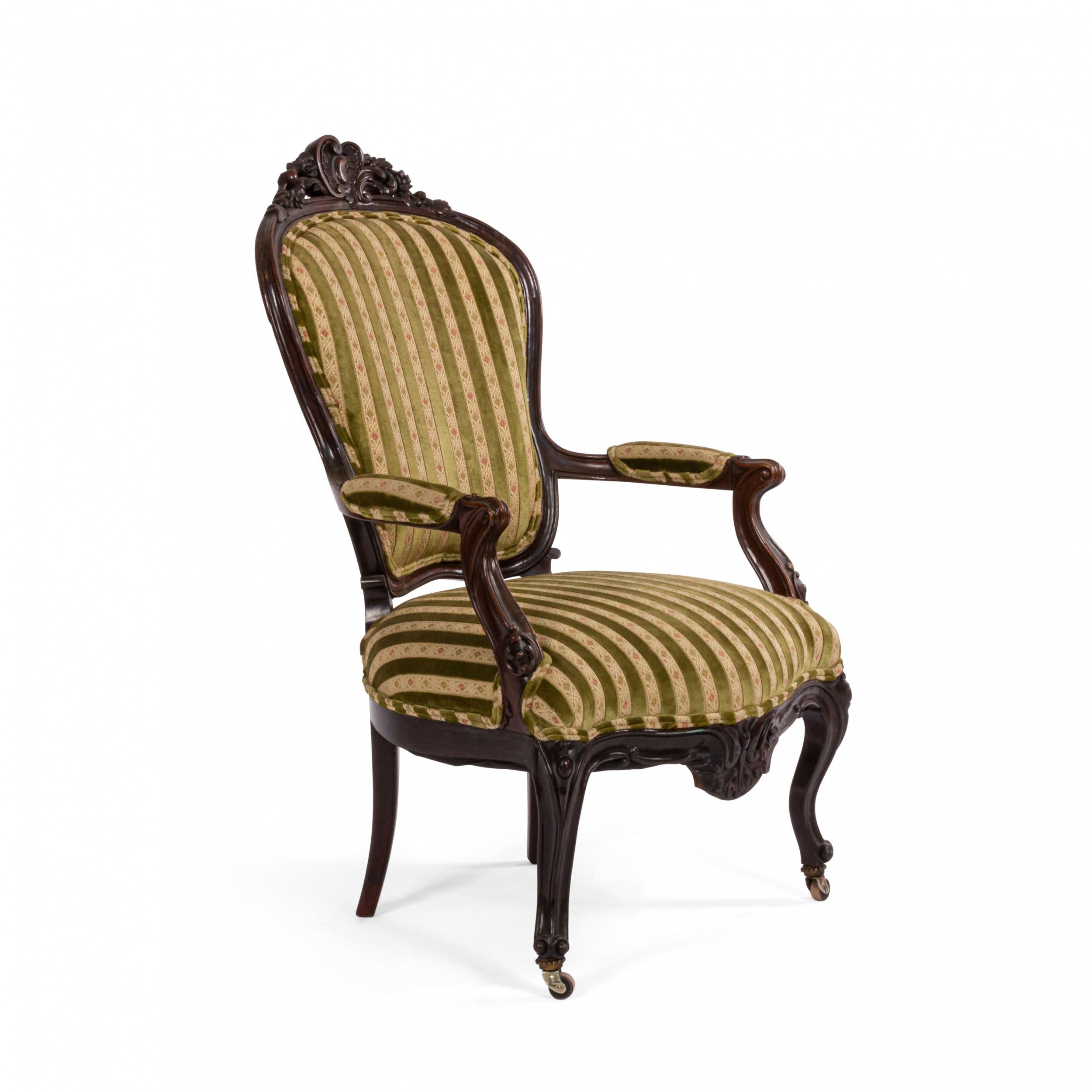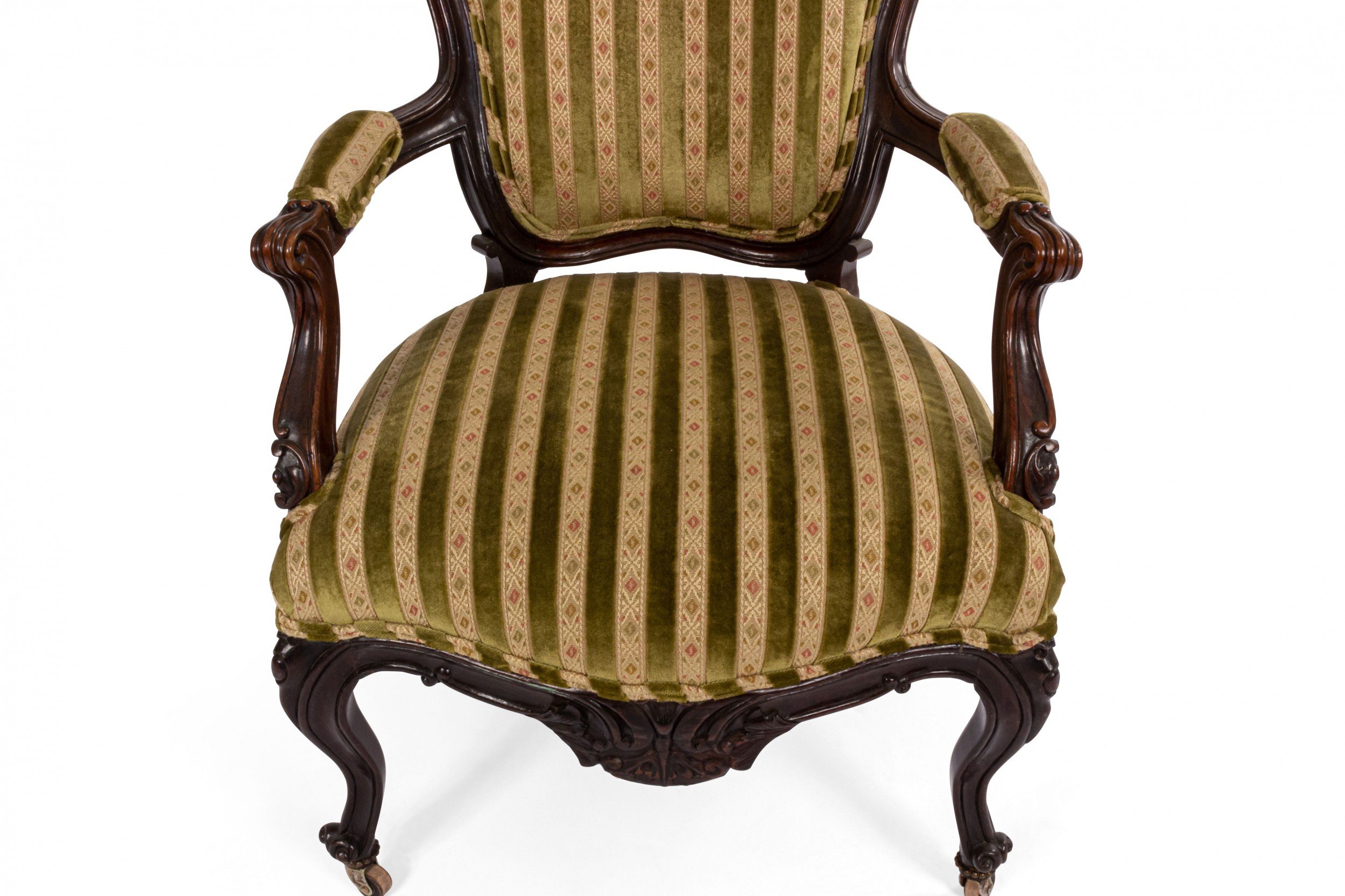 PAIR of French Victorian rosewood armchairs with carved back crest rail and striped velvet upholstery (similar to #038110).