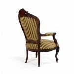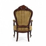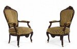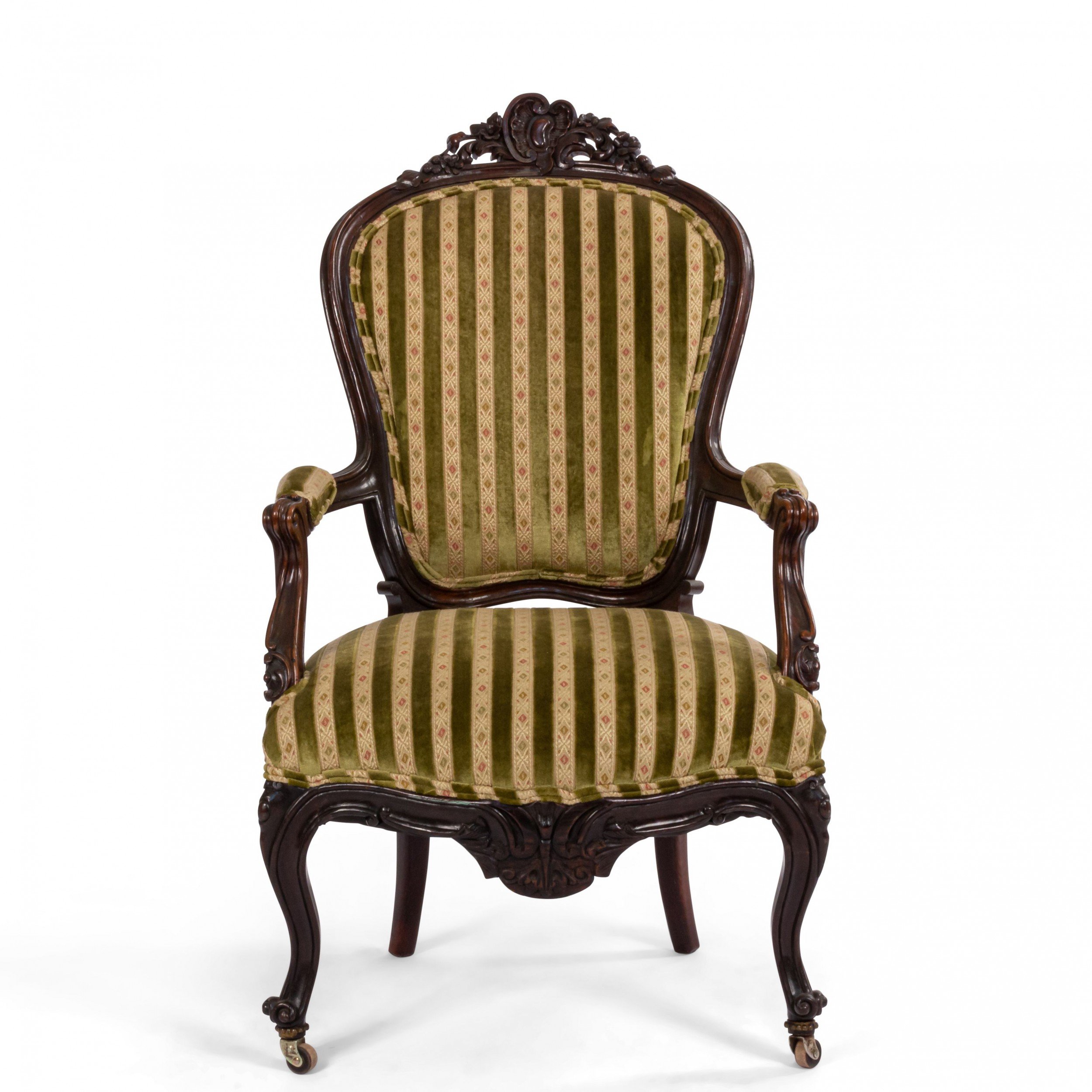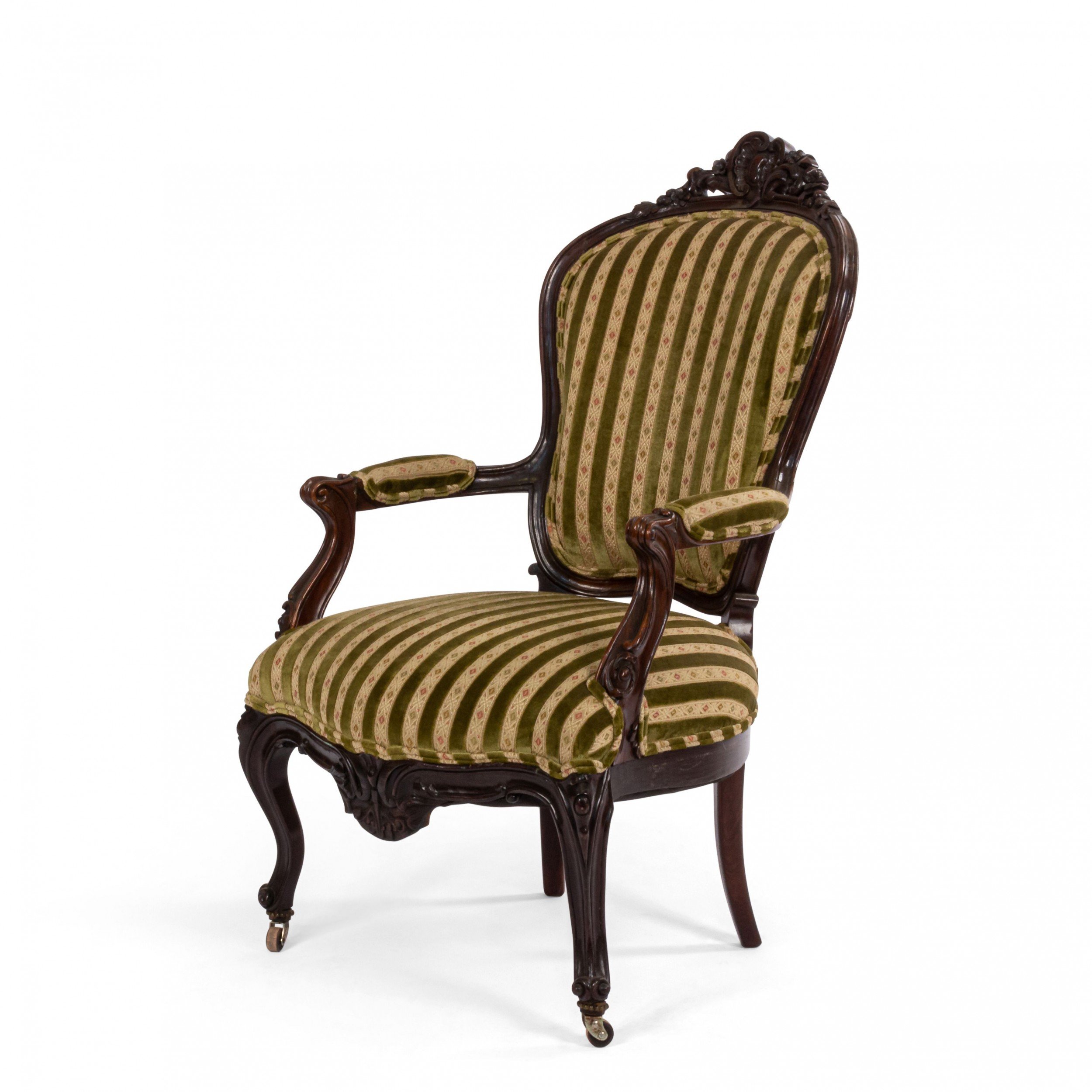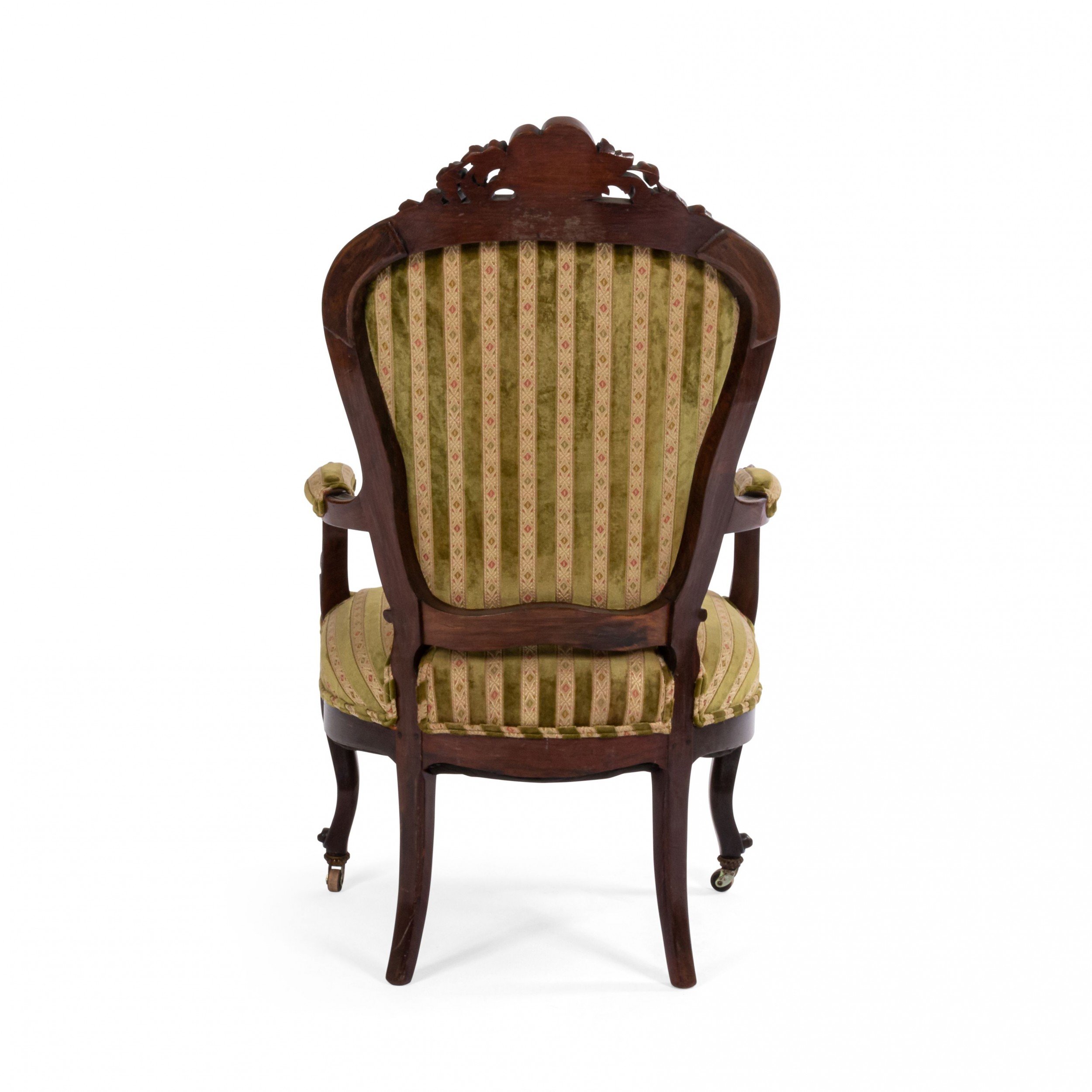 PAIR of French Victorian rosewood armchairs with carved back crest rail and striped velvet upholstery (similar to #038110).